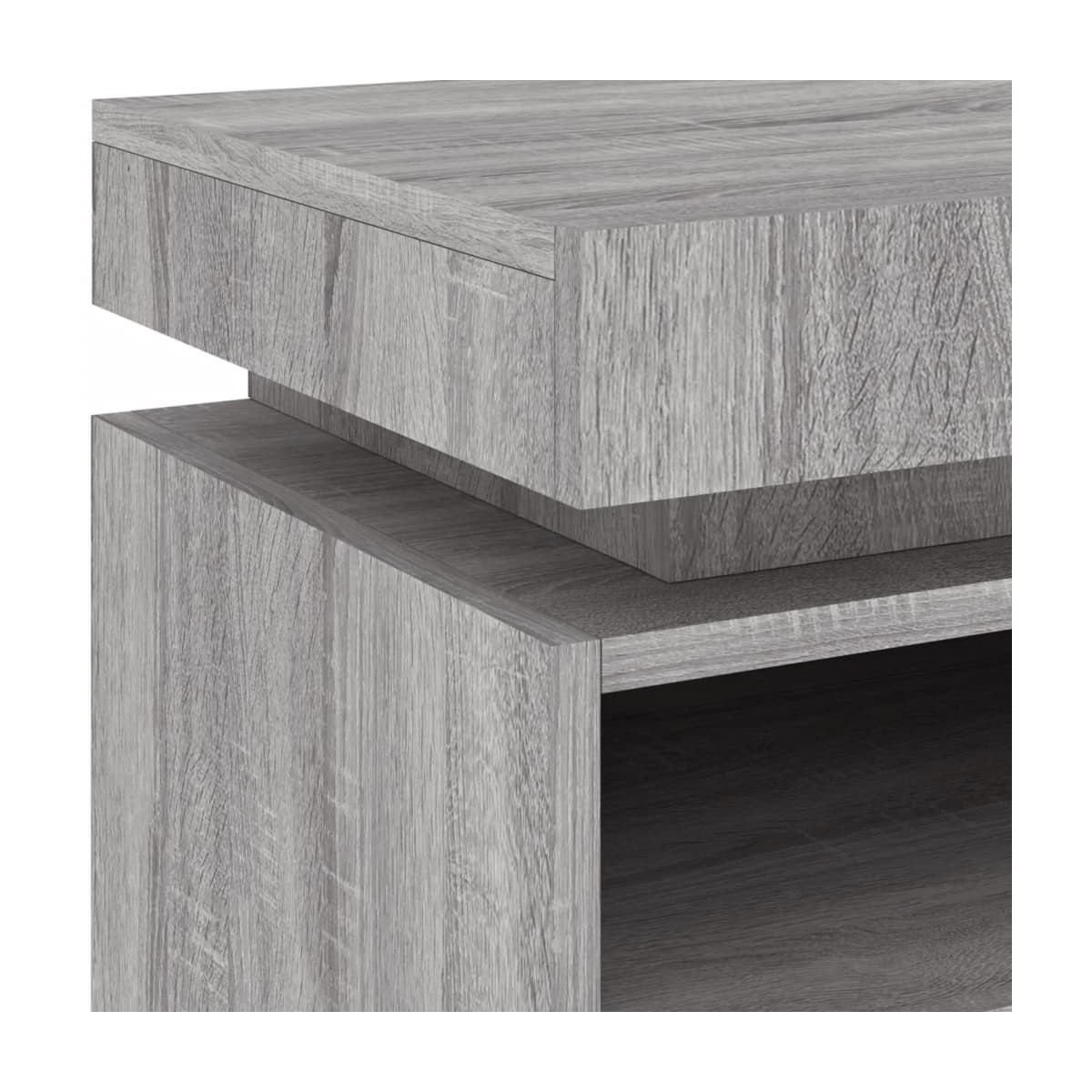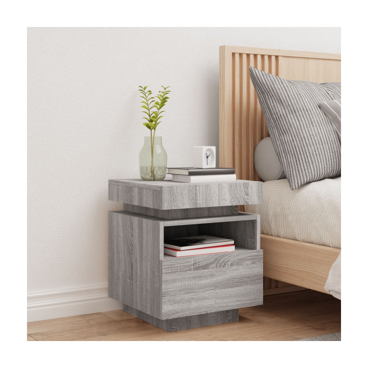 Con un diseño moderno pero práctico, esta mesita de noche con luz LED se convertirá definitivamente en el foco de atención de tu habitación. Material duradero: La madera de ingeniería tiene una calidad excepcional, con una superficie lisa y también cuenta con fuerza, estabilidad y resistencia a la humedad.Luces LED RGB: Esta mesita de noche cuenta con luces LED RGB, que tienen diferentes menús para cambiar el color de las luces y permitir que el color se ajuste de forma automática.Amplio espacio de almacenaje: La mesita de noche ofrece un práctico espacio de almacenaje para guardar bien organizados y al alcance revistas, mandos a distancia y otros objetos pequeños.Función de exhibición: La robusta parte superior del armario multimedia es ideal para exponer objetos decorativos, marcos de fotos o plantas en maceta. Información útil:El producto tiene un conector USB, pero no se incluye la fuente de alimentación USB de 5 V certificada.