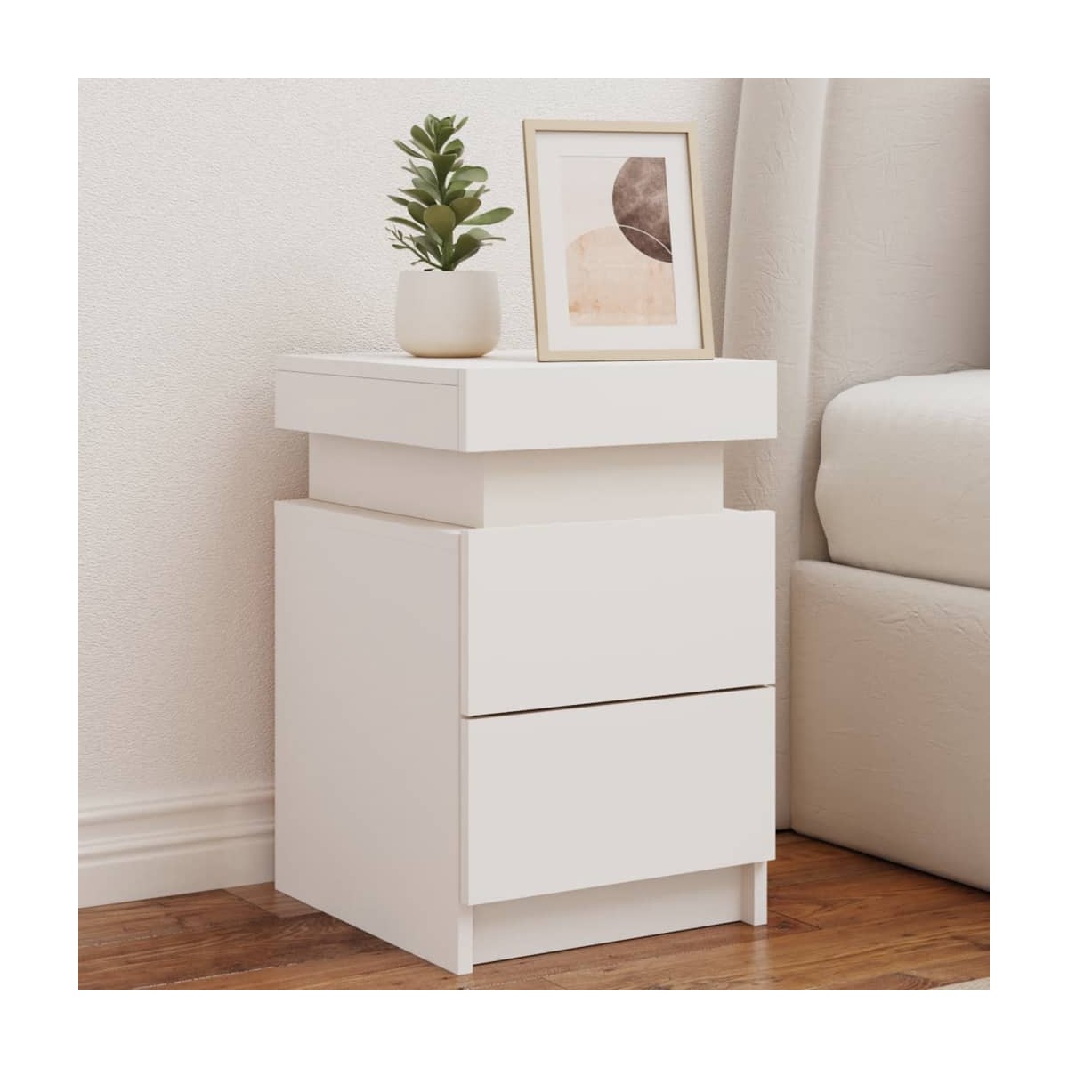 Decora el dormitorio con esta moderna mesita de noche con luces LED, que combina fácilmente con muebles de cualquier estilo. Material duradero: La madera de ingeniería tiene una calidad excepcional, con una superficie lisa y también cuenta con fuerza, estabilidad y resistencia a la humedad.Amplio espacio de almacenamiento: La mesita de noche ofrece un montón de espacio de almacenaje para guardar bien organizados y al alcance de la mano revistas, libros, mandos a distancia y otros objetos pequeños.Función expositora: La robusta superficie del mueble auxiliar es ideal para poner objetos decorativos, marcos de fotos o plantas.Luces LED ajustables: Este mueble está equipado con luces LED RGB, que cuentan con diferentes menús para cambiar el color de la luz y ajustarlo automáticamente, para que la decoración de casa sea colorida y bonita. Advertencia:Para evitar que vuelque, este producto debe usarse con el dispositivo de fijación a la pared incluido. Información útil:El producto tiene un conector USB que necesita una fuente de alimentación USB certificada de 5 V (no incluida).