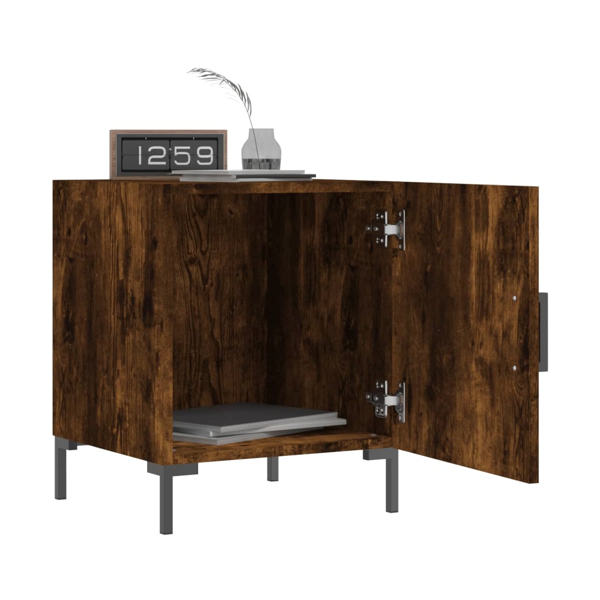¡Da un toque de encanto moderno a la casa con estas mesitas de noche! Material duradero: La madera de ingeniería tiene una calidad excepcional, con una superficie lisa y también cuenta con fuerza, estabilidad y resistencia a la humedad. Amplio espacio de almacenaje: La mesita de noche tiene un compartimento, por lo que ofrece un amplio espacio de almacenaje para mantener al alcance libros, aparatos multimedia y otros objetos.Función expositora: También puedes colocar tus fotos favoritas, adornos o flores en la superficie de esta mesita auxiliar para alegrarte la vida. Patas de metal: Las patas metálicas añaden un estilo tranquilo a la casa a la vez que garantizan la estabilidad.Práctica puerta: Mantén tus cosas libres de polvo ocultándolas detrás de la puerta. Advertencia: Para evitar que vuelque, este producto debe usarse con el dispositivo de fijación a la pared incluido.