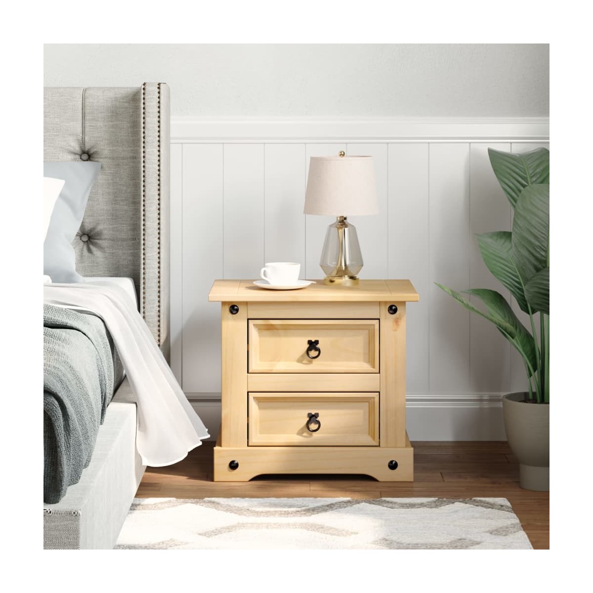 Con un diseño elegante, esta mesita de noche de madera encaja en el dormitorio o el salón con facilidad y añade un encanto atemporal a la casa. Madera maciza de pino: La madera maciza de pino es un hermoso material natural. La madera de pino tiene unas vetas rectas, y los nudos le dan su característico aspecto rústico. Hecha de madera maciza de pino, la mesita de noche es duradera y resistente.Espacio amplio de almacenaje: La mesita de noche cuenta con 2 cajones prácticos, que ayudarán a mantener tus cosas a mano.Fácil de mantener: La mesita de noche es fácil de limpiar con un paño húmedo y requiere menos mantenimiento.Tirador de metal: El armario de cama viene con tiradores de anilla metálicos que facilitan la apertura y el cierre de los cajones además de añadir un toque de belleza. Advertencia:Para evitar que vuelque, este producto debe usarse con el dispositivo de fijación a la pared suministrado.