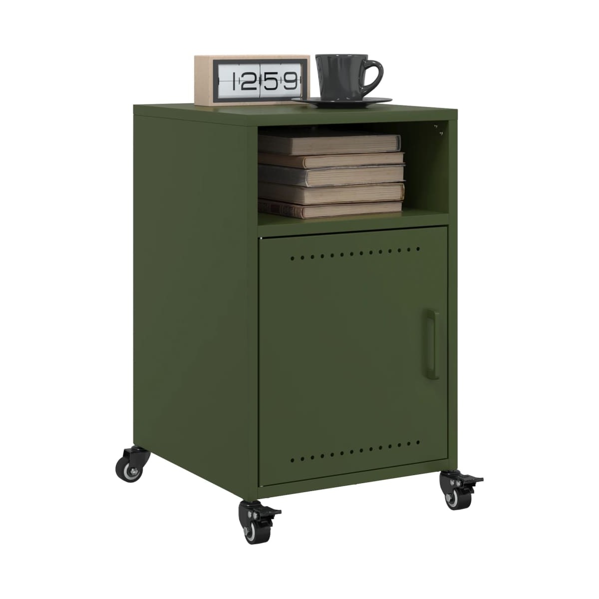 Esta mesita de noche, con un diseño elegante, es un aporte atemporal para la decoración de tu hogar. Material estable: La estructura de la mesita de noche está hecha de acero laminado en frío. El acero laminado en frío es un tipo de acero con bajo contenido en carbono producido mediante un método de laminación en frío y procesado a temperaturas ambiente cercanas a las normales. El acero laminado en frío tiene una superficie más lisa, mayor resistencia y mayor precisión.Amplio espacio de almacenaje: Este mueble ofrece un práctico espacio de almacenaje para mantener revistas, libros, mandos a distancia y otros objetos pequeños bien organizados y al alcance.Fácil de mantener: La mesa se limpia fácilmente con un paño húmedo y requiere menos mantenimiento.Fácil de mover: Esta mesa auxiliar tiene 4 ruedas, lo que hace que se mueva con flexibilidad y se estacione de manera estable en cualquier momento.Tirador práctico: La mesita de noche viene con un tirador que facilita abrir y cerrar el mueble, además de añadir un toque de belleza.