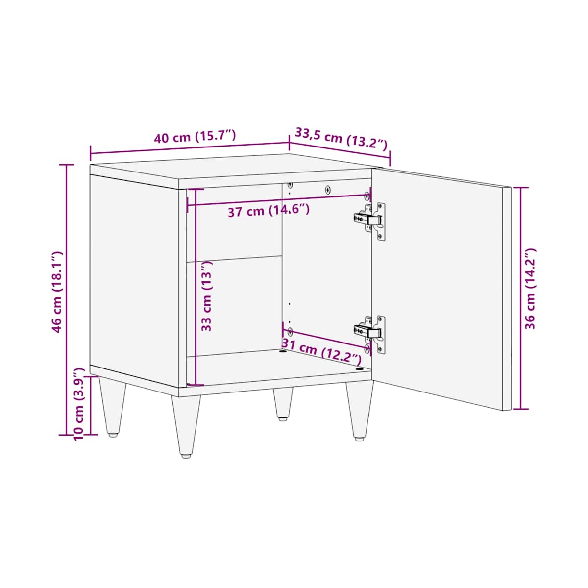 Esta mesita de noche, con un diseño elegante, es un aporte atemporal para la decoración de tu hogar. Material robusto y estable: La madera maciza de mango, una madera dura tropical robusta, es muy apreciada para la fabricación de muebles por su excepcional durabilidad y resistencia. Las bonitas vetas de la madera hacen que cada mueble sea ligeramente diferente al resto.Amplio espacio de almacenamiento: la mesita de noche ofrece un amplio espacio de almacenamiento para revistas, libros, vasos y otros elementos esenciales para la hora de dormir, manteniéndolos organizados y al alcance.Uso versátil: Esta mesita de noche no es solo para el dormitorio, también se puede utilizar como mesa auxiliar en la sala de estar o espacio de almacenamiento adicional en cualquier habitación, adaptándose perfectamente a sus necesidades.Patas de madera: Esta cama está sostenida por robustas patas, que garantizan estabilidad, seguridad y firmeza. Información útil:Cada artículo es único, con variaciones de color y veta. La entrega es aleatoria garantizando la exclusividad y la individualidad del producto.