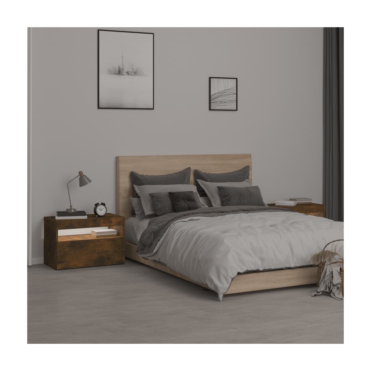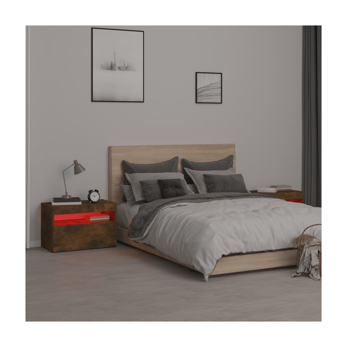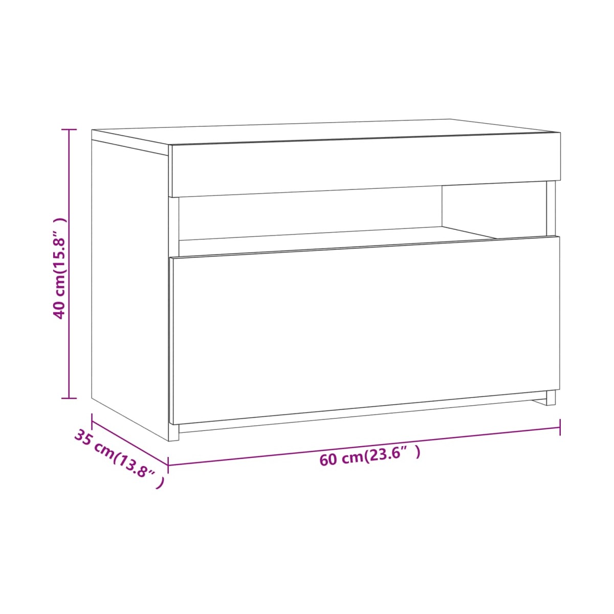 ¡Dale a tu hogar un encanto moderno con esta elegante mesita de noche! Con un diseño a la moda y práctico, esta mesita de noche con luces LED definitivamente se convertirá en el centro de atención de la estancia. Material práctico: La madera contrachapada tiene una calidad excepcional, con una superficie lisa y también cuenta con fuerza, estabilidad y resistencia a la humedad. Luces LED de colores: El mueble cuenta con luces LED RGB, que tienen diferentes menús para cambiar el color de las luces y permitir que el color se ajuste automáticamente de manera diferente. Las luces LED subrayan el aspecto moderno y refuerzan el estilo a la última.Amplio espacio de almacenamiento: La mesita de noche ofrece un montón de espacio de almacenaje para guardar bien organizados y al alcance de la mano revistas, libros, mandos a distancia y otros objetos pequeños.Función de visualización: La robusta superficie del mueble auxiliar es ideal para exhibir objetos decorativos, marcos de fotos o plantas en macetas. Nota:El producto tiene un conector USB, pero no se incluye la fuente de alimentación USB de 5 V certificada.Cada producto viene con un manual de montaje en la caja para facilitar el montaje.