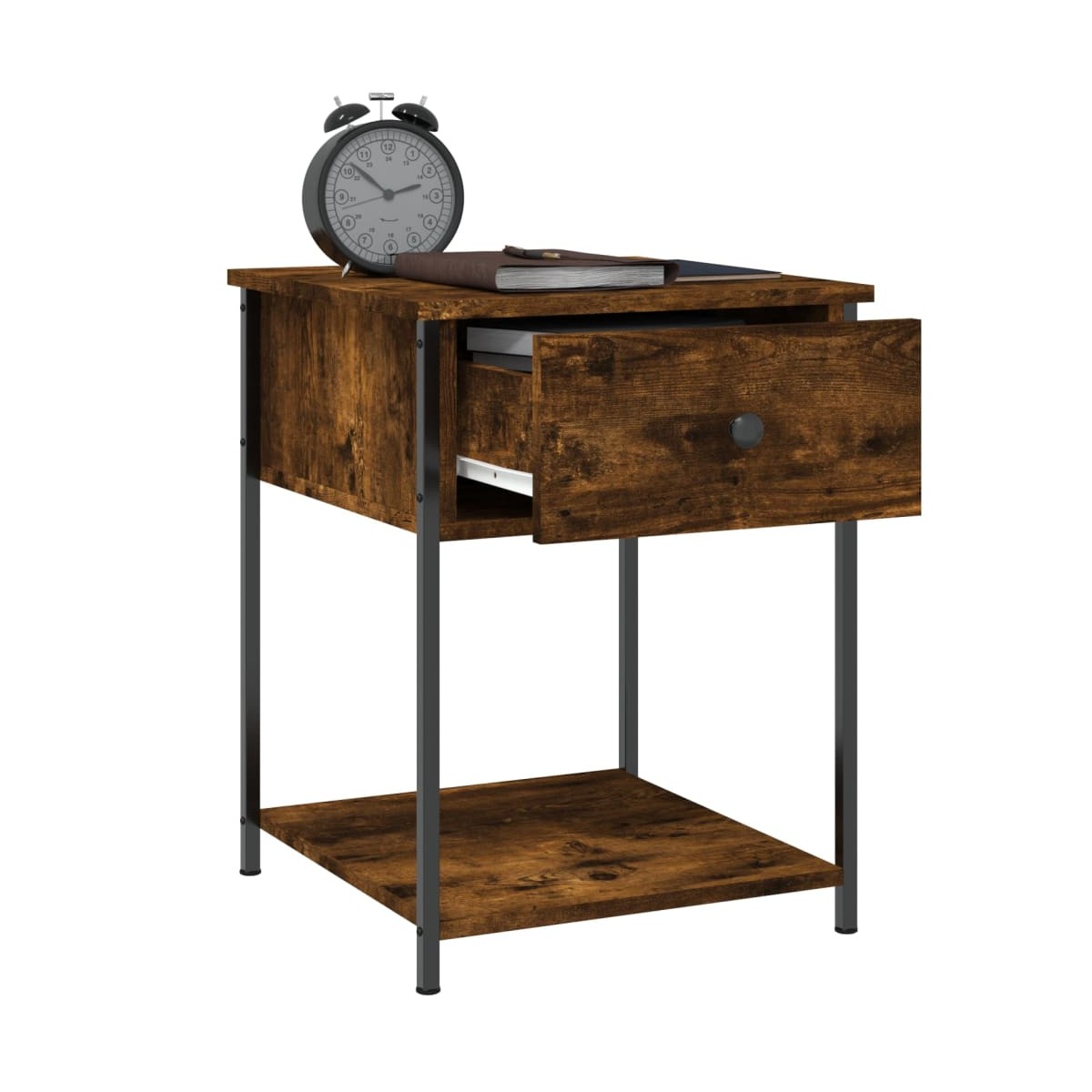 Estas mesitas de noche de diseño elegante son un complemento atemporal para la decoración de interiores. Material duradero: La madera de ingeniería tiene una calidad excepcional, con una superficie lisa y también cuenta con fuerza, estabilidad y resistencia a la humedad. Estructura robusta: La estructura de metal garantiza su solidez y estabilidad.Amplio espacio de almacenaje: La mesita de noche ofrece un amplio espacio de almacenaje para mantener tus artículos de uso diario bien organizados y al alcance. Función expositora: También puedes colocar tus fotos favoritas, adornos o flores en la superficie de esta mesita de noche para alegrarte la vida.Patas ajustables: Cuatro patas ajustables con almohadillas de plástico mantienen el armario auxiliar equilibrado en suelo irregular y aumentan la estabilidad. Advertencia:Para evitar que vuelque, este producto debe usarse con el dispositivo de fijación a la pared incluido.