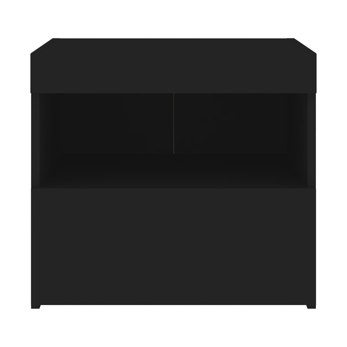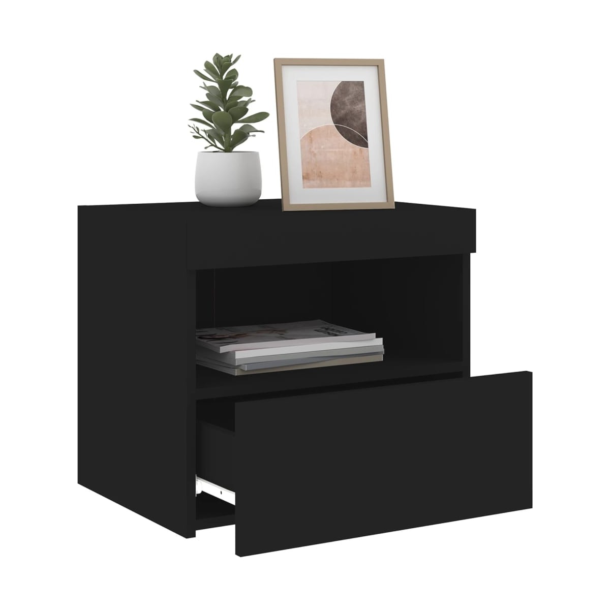 Decora el dormitorio con esta moderna mesita de noche con luces LED, que combina fácilmente con muebles de cualquier estilo. Material duradero: La madera de ingeniería tiene una calidad excepcional, con una superficie lisa y también cuenta con fuerza, estabilidad y resistencia a la humedad.Amplio espacio de almacenamiento: La mesita de noche ofrece un montón de espacio de almacenaje para guardar bien organizados y al alcance de la mano revistas, libros, mandos a distancia y otros objetos pequeños.Función expositora: La robusta superficie del mueble auxiliar es ideal para poner objetos decorativos, marcos de fotos o plantas.Luces LED ajustables: Este mueble está equipado con luces LED RGB, que cuentan con diferentes menús para cambiar el color de la luz y ajustarlo automáticamente, para que la decoración de casa sea colorida y bonita. Información útil:El producto tiene un conector USB que necesita una fuente de alimentación USB certificada de 5 V (no incluida).