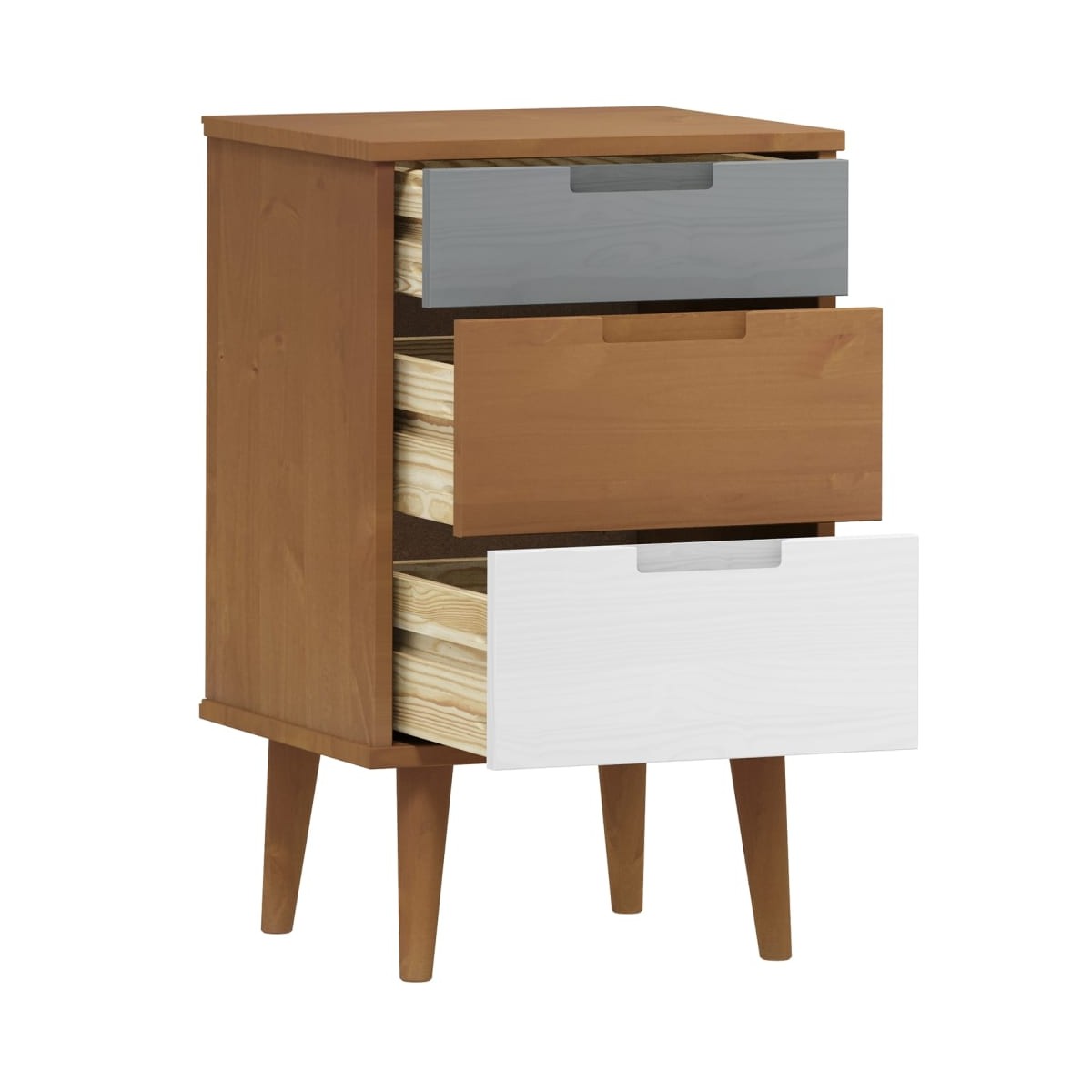 Esta moderna mesita de noche de madera, con encanto escandinavo, está diseñada para elevar tu decoración al siguiente nivel. Madera de pino maciza: La madera de pino maciza es un bonito material natural. La madera de pino tiene vetas rectas, y los nudos dan al material su distintivo aspecto rústico.Barniz UV: El barniz UV es un tipo especial de barniz que se acaba con una máquina de secado ultravioleta. Crea un acabado más vívido, más lujoso y más táctil en comparación con los barnices que no son UV.Estructura estable: La estructura de madera garantiza su solidez y estabilidad.Amplio espacio de almacenaje: La mesita de noche tiene 3 cajones. Los espaciosos cajones te permiten tener las cosas organizadas.Superficie resistente: La robusta superficie es ideal para colocar objetos decorativos, marcos de fotos o plantas. Advertencia:Para evitar el vuelco, este producto debe usarse con el dispositivo provisto para fijarlo a la pared. Nota:Cada producto viene con un manual de montaje en la caja para facilitar el montaje.