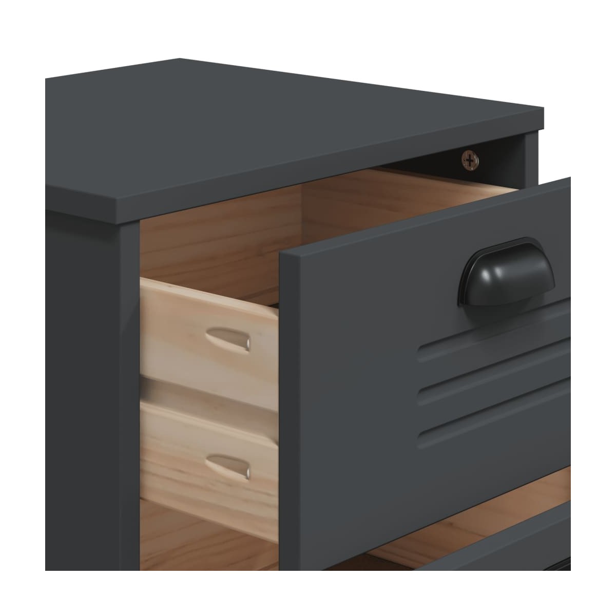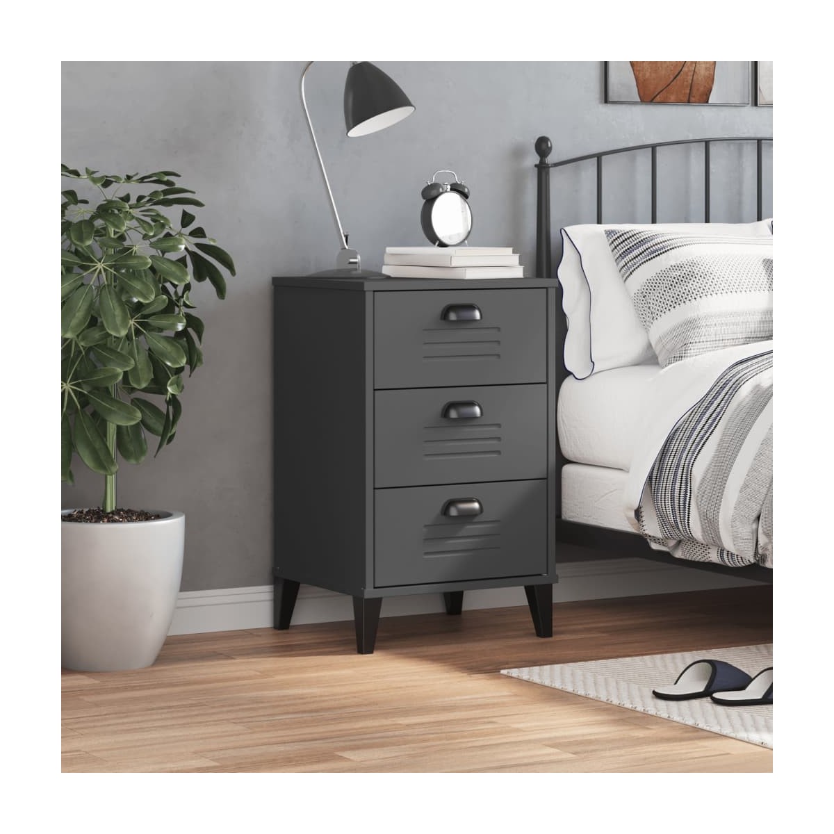Con un diseño elegante, esta mesita de noche se adaptará fácilmente a tu dormitorio o sala de estar y agregará un encanto industrial a tu decoración. Material duradero: La madera de ingeniería tiene una calidad excepcional, con una superficie lisa y también cuenta con fuerza, estabilidad y resistencia a la humedad.Amplio espacio de almacenamiento: La mesita de noche ofrece un amplio espacio de almacenamiento para mantener tus artículos bien organizados y a mano.Fácil de mantener: La mesita auxiliar se limpia fácilmente con un paño húmedo y requiere menos mantenimiento.Práctico tirador: La mesita de noche viene con tiradores que facilitan la apertura y el cierre a la vez que añaden un extra de belleza. Advertencia:Para evitar que vuelque, este producto debe usarse con el dispositivo de fijación a la pared suministrado.