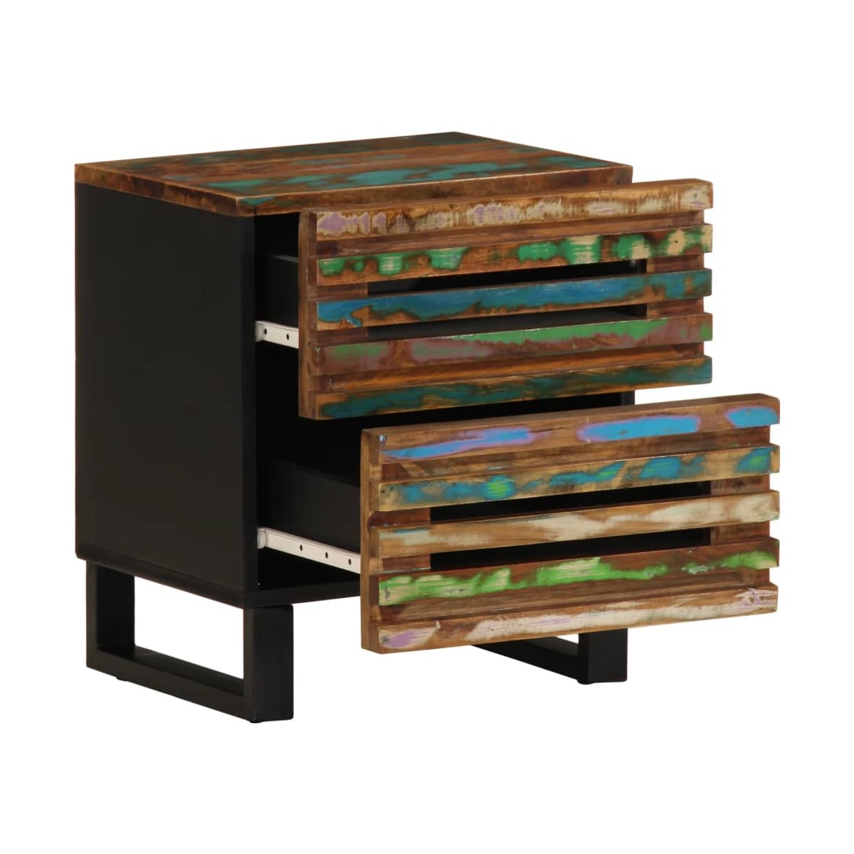 Esta mesita de noche de madera de diseño industrial será a la vez un aporte decorativo y práctico para la decoración de tu hogar. Madera maciza reciclada: La madera maciza reciclada consta de distintas maderas reutilizadas como la teca, la madera de mango, de pino y de haya. Dichos materiales proceden de antiguas construcciones como fábricas, cobertizos y barcos. Como cada pieza está hecha a mano, los colores variarán en cada producto.Amplio espacio de almacenamiento: La mesita de noche cuenta con 2 cajones y proporciona un amplio espacio de almacenamiento para que pueda almacenar y exhibir sus libros, revistas y artículos decorativos, al tiempo que mejora su espacio vital.Patas estables y duraderas: Este armario está sostenido por patas resistentes, lo que garantiza estabilidad, seguridad y firmeza. Información útil:Cada artículo es único, con variaciones de color y veta. La entrega es aleatoria garantizando la exclusividad y la individualidad del producto.