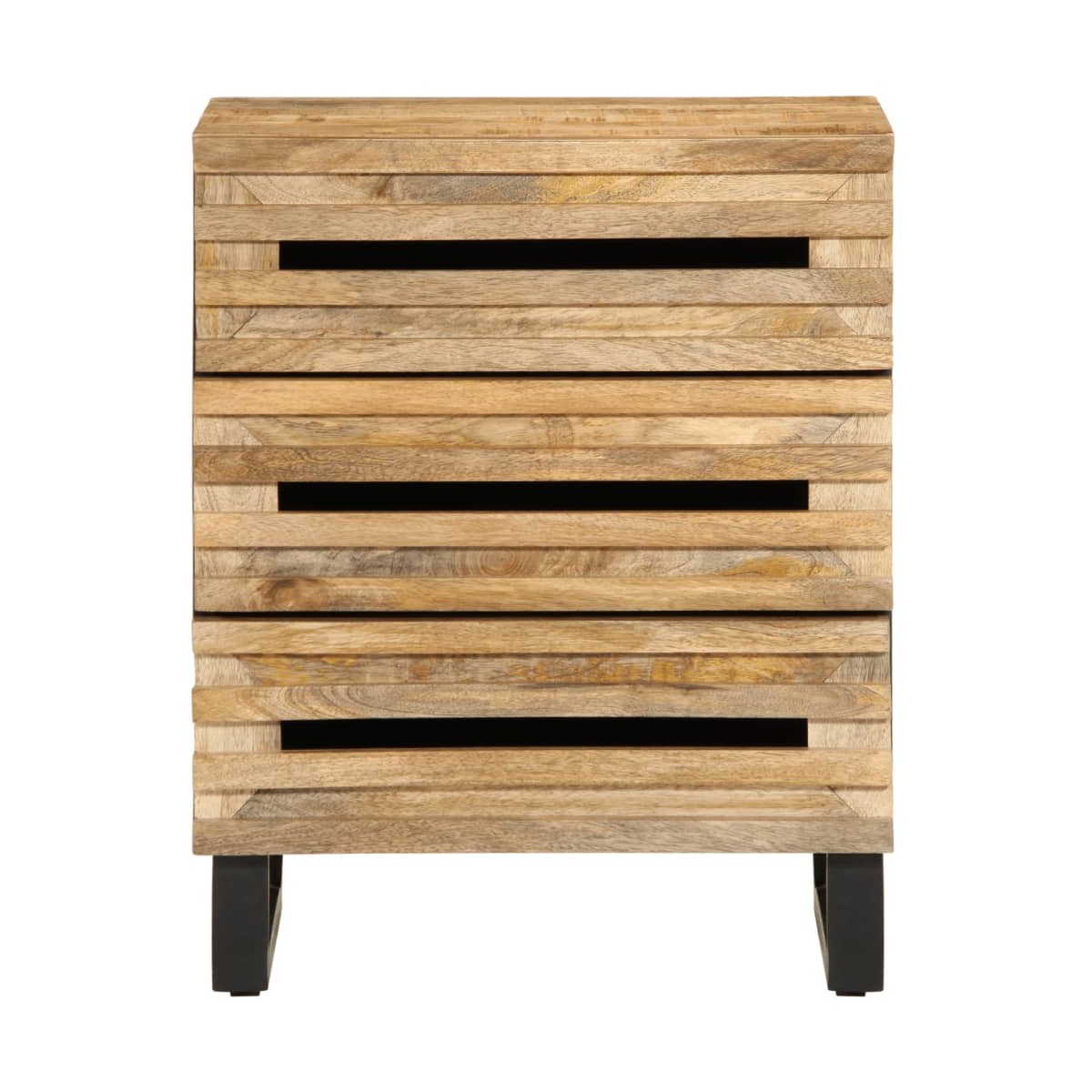 Esta mesita de noche de madera será a la vez un aporte decorativo y práctico para la decoración de tu hogar. Madera maciza de mango: La madera maciza de mango es una madera dura, tropical y resistente, que sirve para hacer muebles robustos. Las bonitas vetas de la madera hacen que cada mueble sea ligeramente diferente al resto.Amplio espacio de almacenamiento: La mesita de noche cuenta con 3 cajones y proporciona un amplio espacio de almacenamiento para que pueda almacenar y exhibir sus libros, revistas y artículos decorativos, al tiempo que mejora su espacio vital.Patas estables y duraderas: Este armario está sostenido por patas resistentes, lo que garantiza estabilidad, seguridad y firmeza. Advertencia:Para evitar que vuelque, este producto debe usarse con el dispositivo de fijación a la pared suministrado.
