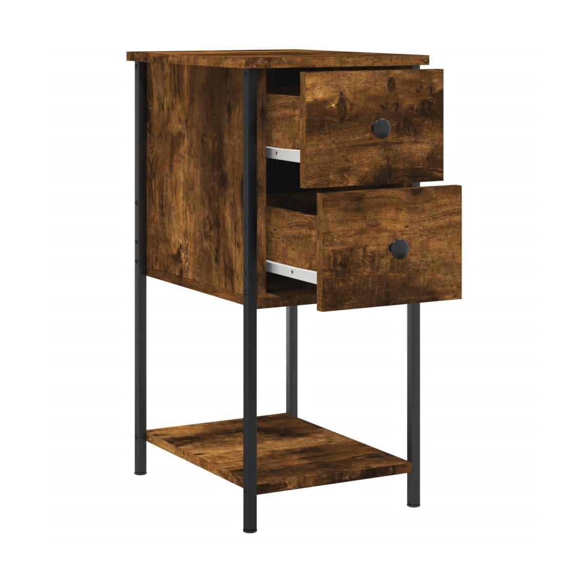 Con un diseño sencillo y compacto, estas mesitas de noche encajan fácilmente en el dormitorio o el salón y añaden un encanto atemporal a la casa. Material duradero: La madera de ingeniería tiene una calidad excepcional, con una superficie lisa y también cuenta con fuerza, estabilidad y resistencia a la humedad. Estructura robusta: La estructura de hierro garantiza su solidez y estabilidad.Amplio espacio de almacenaje: La mesita de noche ofrece un amplio espacio de almacenaje para mantener tus artículos de uso diario bien organizados y al alcance.Función expositora: También puedes colocar tus fotos favoritas, adornos o flores en la superficie de esta mesita auxiliar para alegrarte la vida.Patas ajustables: Cuatro patas ajustables con almohadillas de plástico mantienen el armario auxiliar equilibrado en suelo irregular y aumentan la estabilidad. Advertencia:Para evitar que vuelque, este producto debe usarse con el dispositivo de fijación a la pared incluido.