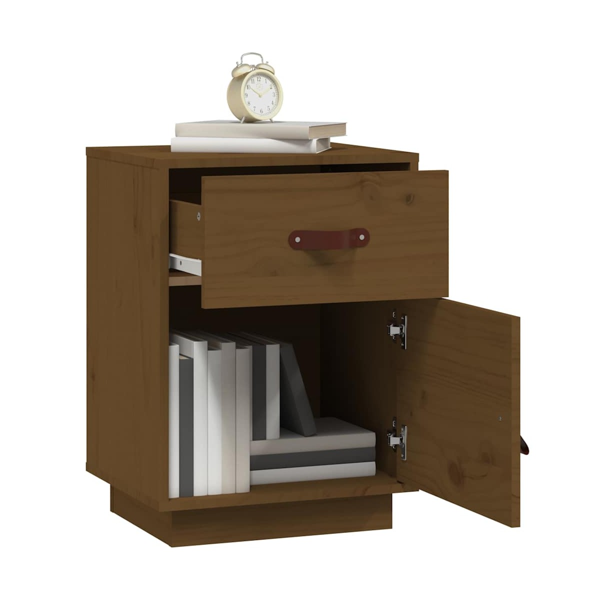 Estas mesitas de noche de madera con un diseño elegante son un complemento atemporal para la decoración de tu hogar. Madera de pino maciza: La madera de pino maciza es un bonito material natural. La madera de pino tiene vetas rectas, y los nudos dan al material su distintivo aspecto rústico.Amplio espacio de almacenamiento: Con 1 cajón y 1 compartimento con puerta, con tiradores de cuero sintético en ambos, cada mueble ofrece un amplio espacio de almacenamiento para guardar revistas, libros, DVD, dispositivos multimedia y otros objetos decorativos bien organizados y al alcance.Instalación flexible de la puerta: La puerta de la mesita de noche puede instalarse a la izquierda o a la derecha, según tus hábitos personales y tu comodidad.Superficie resistente: La robusta superficie de la mesilla de noche es ideal para colocar objetos decorativos, marcos de fotos o plantas. Nota:Cada producto viene con un manual de montaje en la caja para facilitar el montaje. Advertencia:Para evitar el vuelco, este producto debe usarse con el dispositivo provisto para fijarlo a la pared.