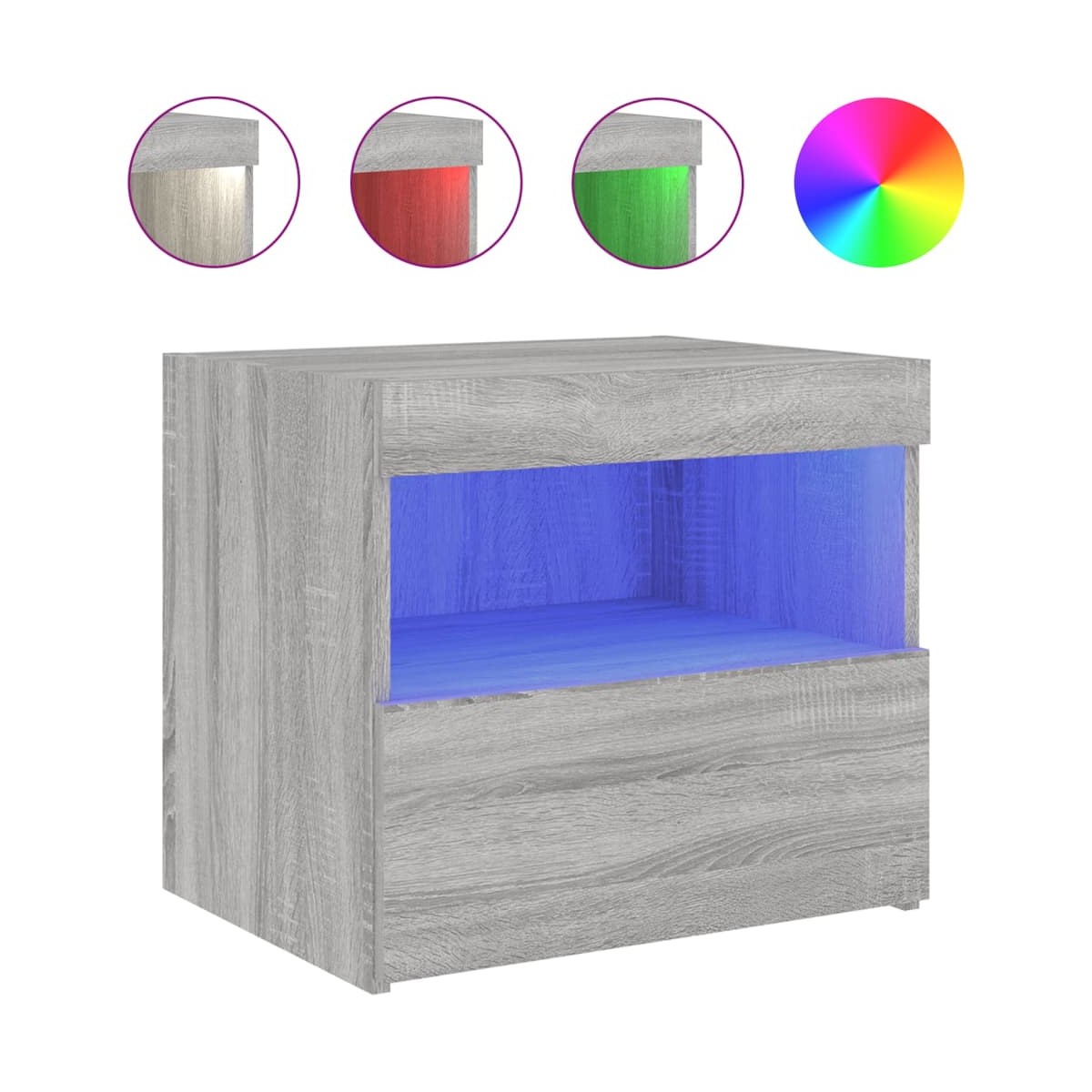 Decora el dormitorio con estas modernas mesitas de noche con luces LED, que pueden combinar fácilmente con muebles de cualquier estilo. Material duradero: La madera de ingeniería tiene una calidad excepcional, con una superficie lisa y también cuenta con fuerza, estabilidad y resistencia a la humedad.Amplio espacio de almacenamiento: Las mesitas de noche ofrecen un montón de espacio de almacenaje para guardar bien organizados y al alcance de la mano revistas, libros, mandos a distancia y otros objetos pequeños.Función de visualización: Las robustas superficies de los muebles auxiliares son ideales para exhibir objetos decorativos, marcos de fotos o plantas en macetas.Luces LED ajustables: Estas mesitas de noche están equipadas con luces LED RGB, que tienen diferentes menús para cambiar el color de la luz y ajustarlo automáticamente, lo que decora tu hogar colorido y hermoso. Información útil:El producto tiene un conector USB que necesita una fuente de alimentación USB certificada de 5 V (no incluida).