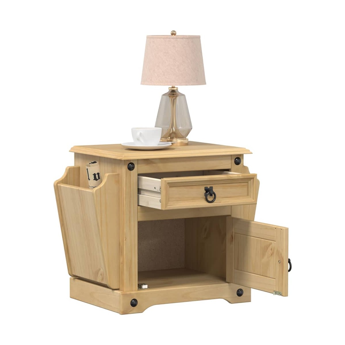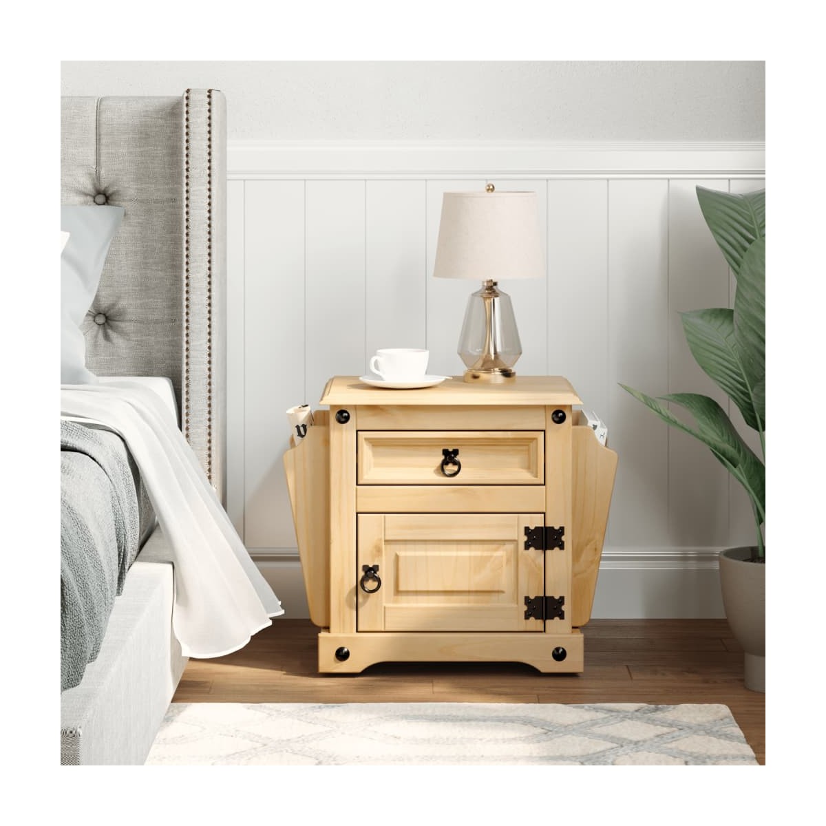 Con un diseño elegante, esta mesita de noche de madera encaja en el dormitorio o el salón con facilidad y añade un encanto atemporal a la casa. Madera maciza de pino: La madera maciza de pino es un hermoso material natural. La madera de pino tiene unas vetas rectas, y los nudos le dan su característico aspecto rústico. Hecha de madera maciza de pino, la mesita de noche es duradera y resistente.Amplio espacio de almacenaje: La mesilla de noche cuenta con revisteros a ambos lados, un práctico cajón y un compartimento, que ayudan a tener a mano tus cosas.Fácil de mantener: La mesita de noche es fácil de limpiar con un paño húmedo y requiere menos mantenimiento.Tirador de metal: El armario de cama viene con tiradores de anilla metálicos que facilitan la apertura y el cierre de los cajones además de añadir un toque de belleza. Advertencia:Para evitar que vuelque, este producto debe usarse con el dispositivo de fijación a la pared suministrado.
