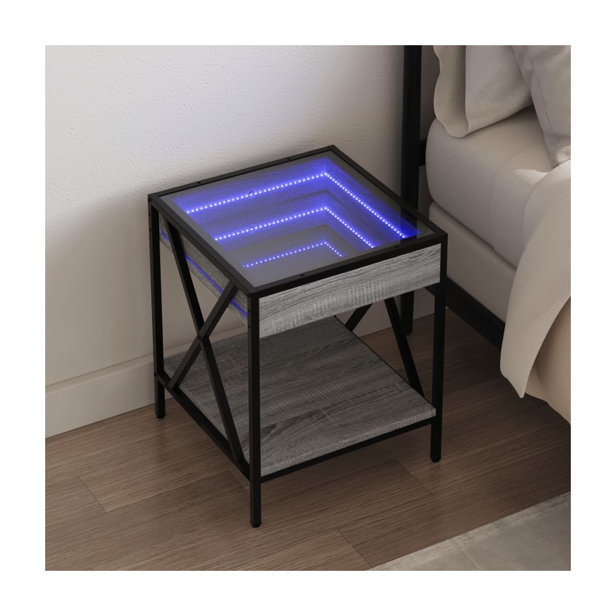 Esta mesita de noche con espejo LED infinito es un aporte atemporal para tu decoración de hogar. Material estable y duradero: La madera de ingeniería es un material duradero y estable con una superficie lisa que es resistente a la humedad, la deformación y la rotura, lo que la convierte en una opción fiable para una variedad de proyectos. Estructura robusta: La estructura metálica de la mesa añade un estilo industrial a tu hogar al tiempo que garantiza robustez, estabilidad y longevidad. Luces LED RGB para un ambiente agradable: Esta mesa cuenta con luces LED que se pueden ajustar fácilmente para crear un espectáculo de luces personalizado. Puedes personalizar los modos, los colores y el brillo para mejorar el ambiente de tu espacio de interior.Superficie estable y resistente: La resistente superficie de la mesa es ideal para dejar objetos decorativos o cualquier otra cosa que necesites al alcance de la mano. Información útil: El producto tiene un conector USB que necesita una fuente de alimentación USB certificada de 5 V (no incluida).