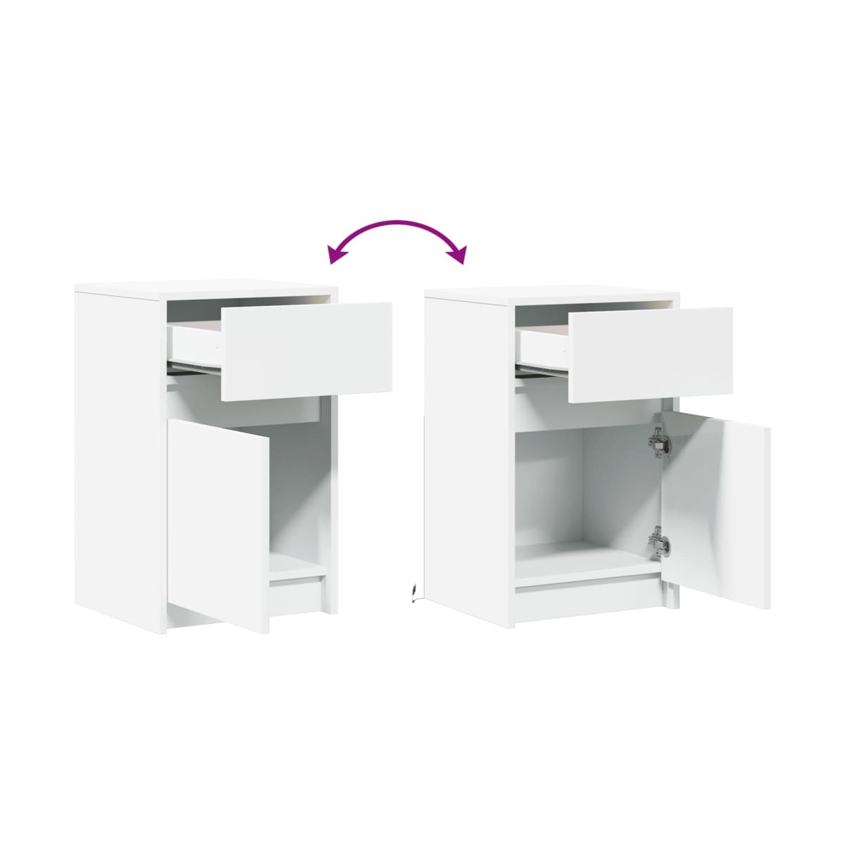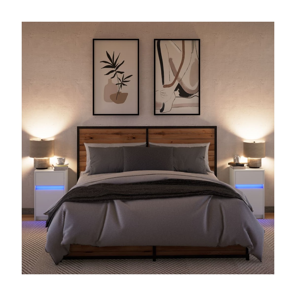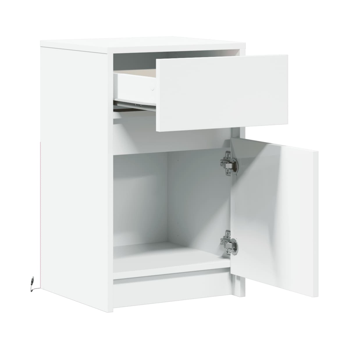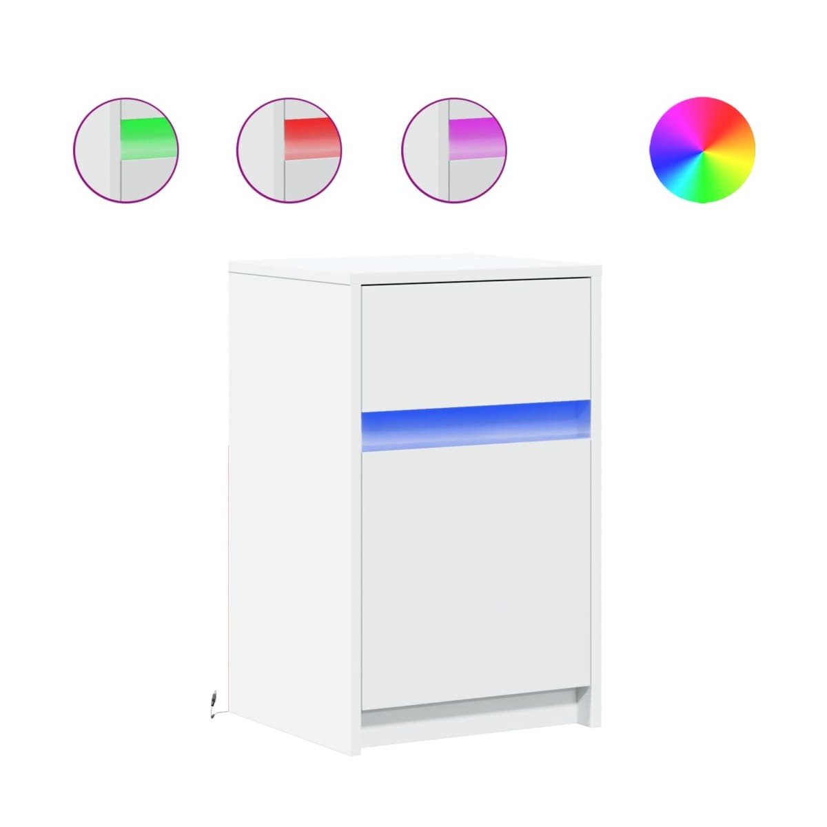 Con un diseño elegante, estas mesitas de noche encajan fácilmente en tu dormitorio o sala de estar y agregan un encanto atemporal a tu decoración. Material duradero:La madera de ingeniería tiene una calidad excepcional, con una superficie lisa y también con fuerza, estabilidad y resistencia a la humedad.Amplio espacio de almacenamiento: La mesita de noche con cajón ofrece un amplio espacio de almacenamiento para mantener tus diversos artículos de uso diario bien organizados y al alcance.Luces LED RGB para un ambiente agradable: Esta mesa auxiliar cuenta con luces LED que se pueden ajustar fácilmente para crear un espectáculo de luces personalizado. Puedes personalizar los modos, los colores y el brillo para mejorar el ambiente de tu hogar.Fácil de mantener: Gracias a su superficie lisa, el armario auxiliar es fácil de limpiar con un paño húmedo y requiere menos mantenimiento. Advertencia:Para evitar que vuelque, este producto debe usarse con el dispositivo de fijación a la pared suministrado.Información útil:El producto tiene un conector USB que necesita una fuente de alimentación USB certificada de 5 V (no incluida).