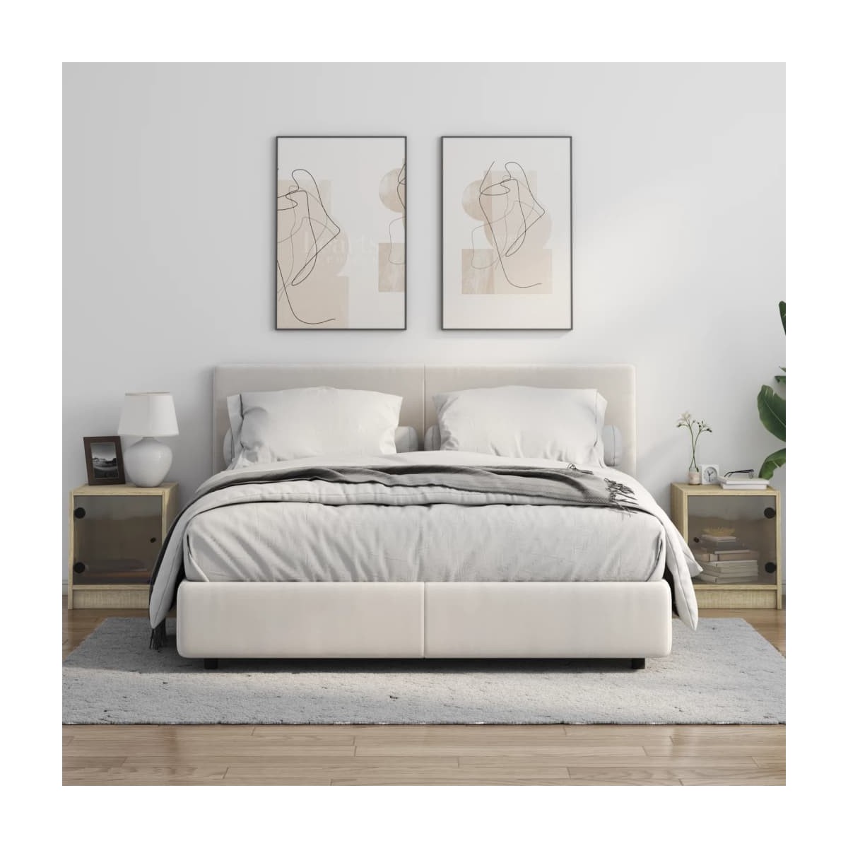 Estas modernas mesitas de noche, con un diseño elegante, son un aporte atemporal para la decoración de la casa. Material duradero: La madera de ingeniería tiene una calidad excepcional, con una superficie lisa y también cuenta con fuerza, estabilidad y resistencia a la humedad.Amplio espacio de almacenaje: Estas mesitas de noche ofrecen un práctico espacio de almacenaje para guardar bien organizados y al alcance revistas, mandos a distancia y otros objetos pequeños.Superficie estable: Las mesitas de noche cuentan con una superficie estable que puede ser utilizada para colocar lámparas de mesa, libros, etc.Prácticas puertas de vidrio: Mantén tu espacio despejado guardando los pequeños objetos esenciales detrás de las puertas de mueble de dormitorio. Además, las puertas de vidrio te permiten ver el interior de las mesitas de noche para exponer los objetos de forma bonita.