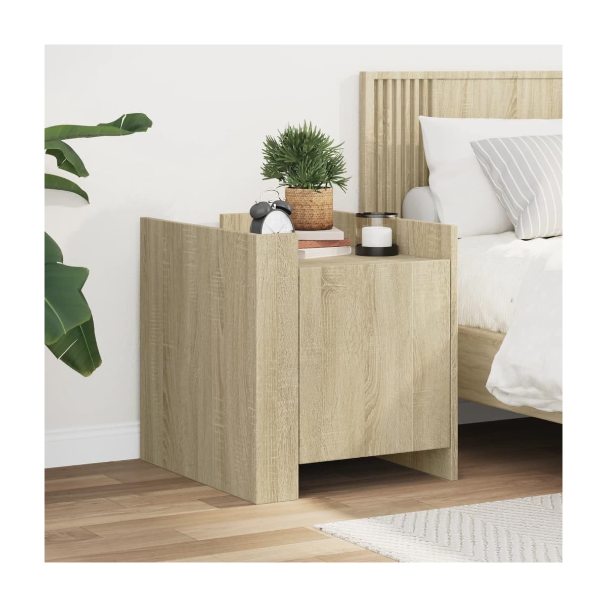 Con un diseño elegante, esta mesita de noche se integrará fácilmente en tu dormitorio o salón, aportando un encanto atemporal a tu decoración. Estructura robusta y estable: La madera de ingeniería tiene una calidad excepcional, con una superficie lisa y también cuenta con fuerza, estabilidad y resistencia a la humedad.Espacio amplio de almacenaje: La mesilla de noche cuenta con un práctico compartimento, que te ayudarán a tener a mano todo lo que necesites.Fácil de limpiar: Esta mesita de noche es resistente a la humedad y fácil de limpiar para mantenerla como nueva todos los días.Superficie estable y robusta: La superficie de esta mesilla de noche es perfecta para exponer objetos decorativos, marcos de fotos y plantas.Dos formas de montaje: Puedes instalar los dos paneles de esquina en el mismo lado o en lados opuestos, colocando las placas deflectoras en la parte delantera o una en la parte delantera y la otra en la parte trasera. Advertencia:Para evitar que vuelque, este producto debe usarse con el dispositivo de fijación a la pared suministrado.