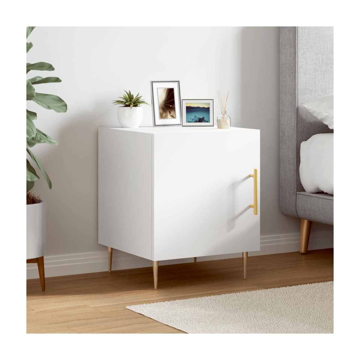 ¡Da un toque de encanto moderno a la casa con esta mesita de noche! Material duradero: La madera contrachapada tiene una calidad excepcional, con una superficie lisa y también cuenta con fuerza, estabilidad y resistencia a la humedad. Amplio espacio de almacenaje: La mesita de noche tiene un compartimento, por lo que ofrece un amplio espacio de almacenaje para mantener al alcance libros, aparatos multimedia y otros objetos.Función expositora: También puedes colocar tus fotos favoritas, adornos o flores en la superficie de esta mesita auxiliar para alegrarte la vida. Patas de metal: Las patas metálicas añaden un estilo tranquilo a la casa a la vez que garantizan la estabilidad.Práctica puerta: Mantén tus cosas libres de polvo ocultándolas detrás de la puerta. Advertencia: Para evitar que vuelque, este producto debe usarse con el dispositivo de fijación a la pared incluido.