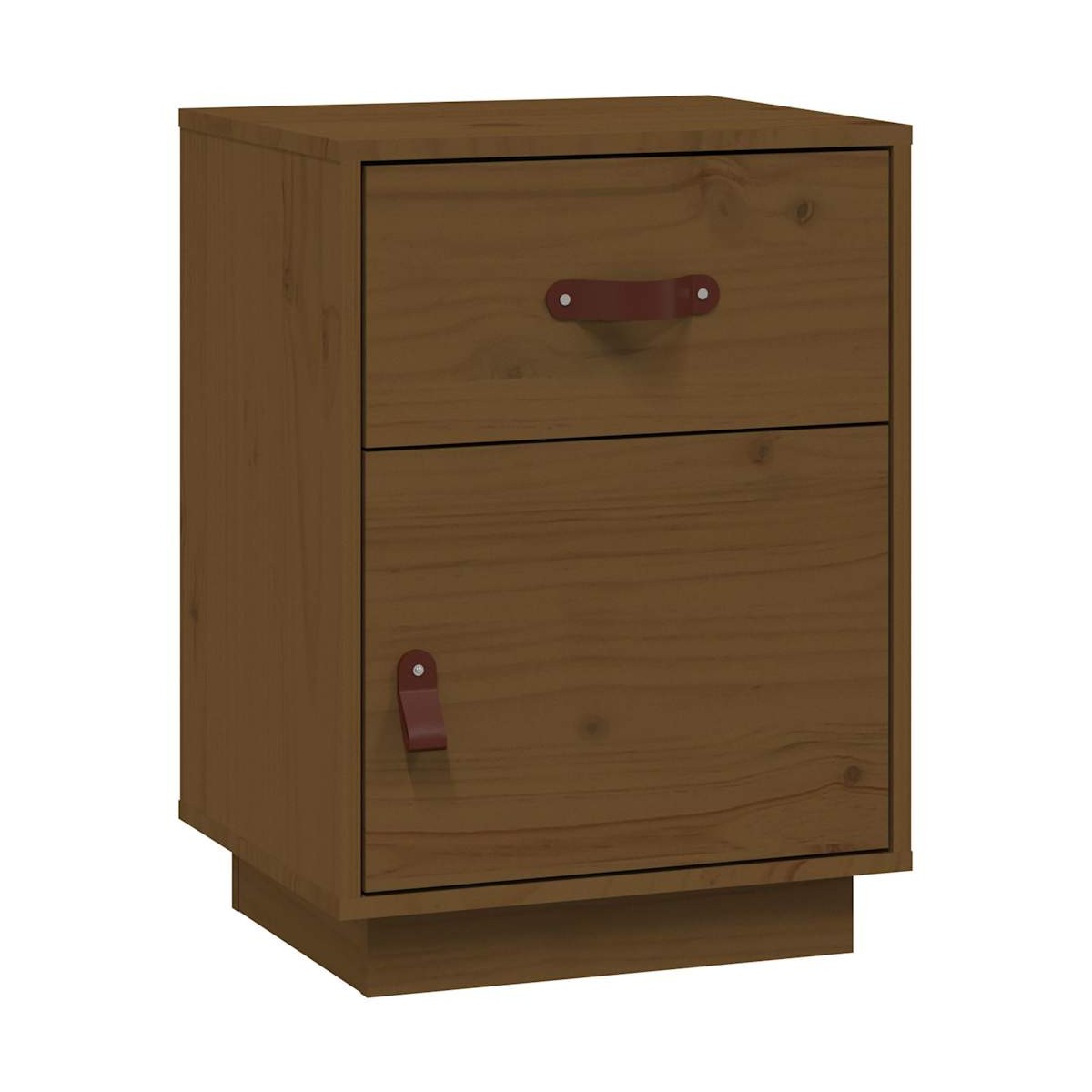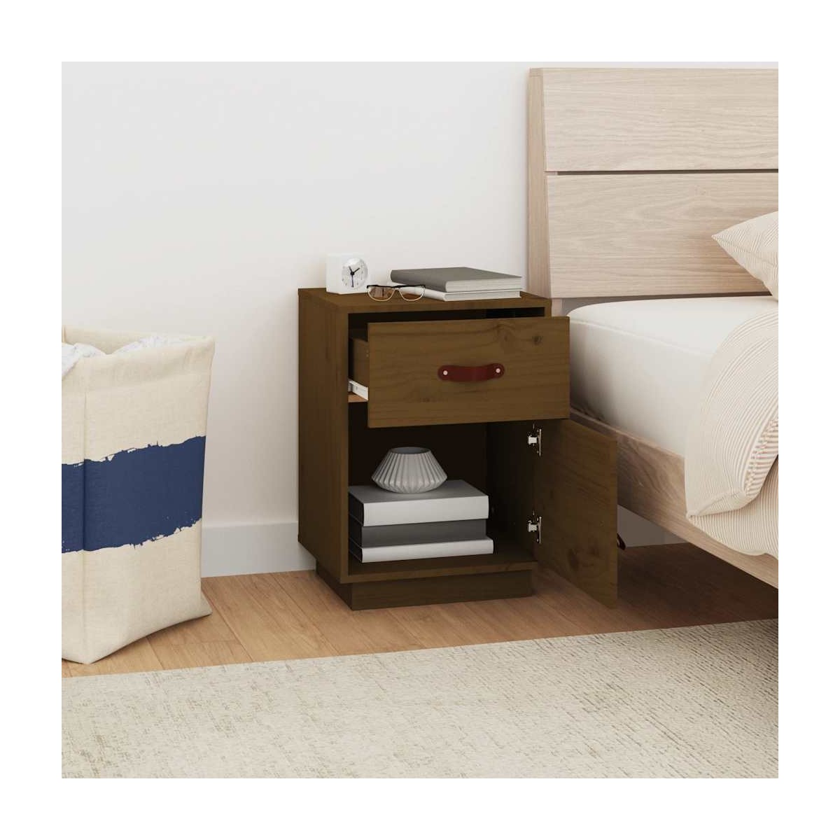 Esta mesita de noche de madera con un diseño elegante es un complemento atemporal para la decoración de la casa. Madera de pino maciza: La madera de pino maciza es un bonito material natural. La madera de pino tiene vetas rectas, y los nudos dan al material su distintivo aspecto rústico.Amplio espacio de almacenamiento: Con 1 cajón y 1 compartimento con puerta, con tiradores de cuero sintético en ambos, este mueble ofrece un amplio espacio de almacenamiento para guardar revistas, libros, DVD, dispositivos multimedia y otros objetos decorativos bien organizados y al alcance.Instalación flexible de la puerta: La puerta de la mesita de noche puede instalarse a la izquierda o a la derecha, según tus hábitos personales y tu comodidad.Superficie resistente: La robusta superficie de la mesilla de noche es ideal para colocar objetos decorativos, marcos de fotos o plantas. Nota:Cada producto viene con un manual de montaje en la caja para facilitar el montaje. Advertencia:Para evitar el vuelco, este producto debe usarse con el dispositivo provisto para fijarlo a la pared.