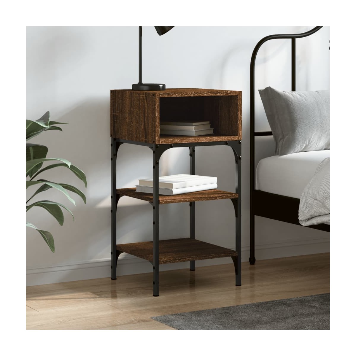 Esta mesita de noche de diseño elegante es un complemento atemporal para la decoración de interiores. Material duradero: La madera contrachapada tiene una calidad excepcional, con una superficie lisa y también cuenta con fuerza, estabilidad y resistencia a la humedad.Amplio espacio de almacenaje: El armario ofrece un amplio espacio de almacenamiento para mantener tus diversos artículos de uso diario bien organizados y al alcance.Patas ajustables: Puedes ajustar la altura de las patas para mantener la mesita de noche estable en suelos irregulares.Estructura robusta: Las estructuras de hierro garantizan la robustez y estabilidad del mueble auxiliar.Función expositora: También puedes colocar tus fotos favoritas, adornos o flores en la superficie de esta mesita auxiliar para alegrarte la vida. Advertencia:Para evitar que vuelque, este producto debe usarse con el dispositivo de fijación a la pared incluido.