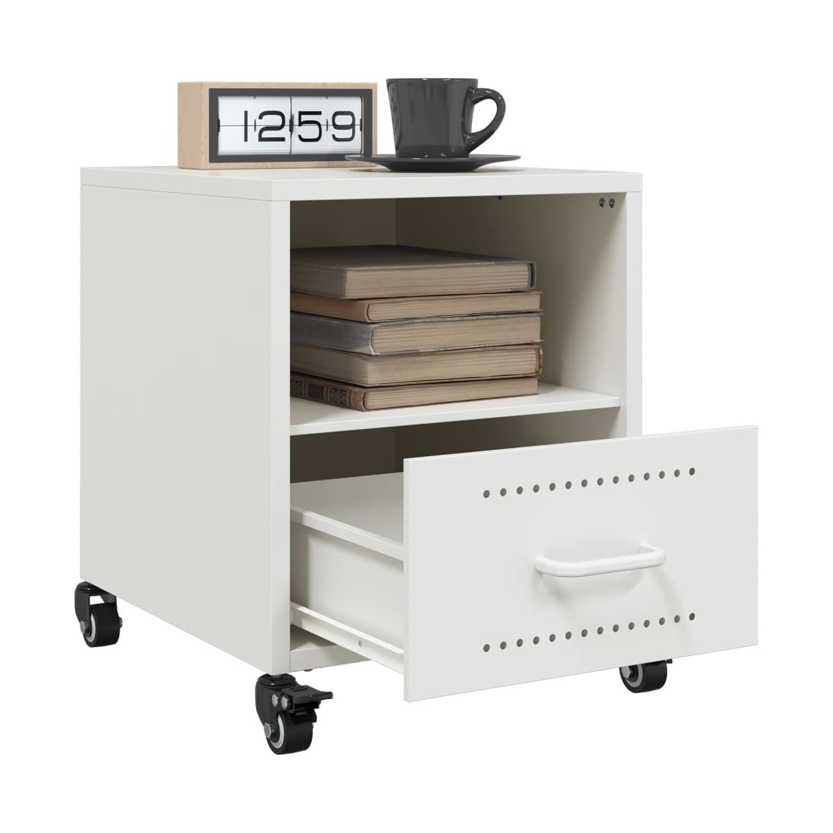 Esta mesita de noche, con un diseño elegante, es un aporte atemporal para la decoración de tu hogar. Material estable: La estructura de la mesita de noche está hecha de acero laminado en frío. El acero laminado en frío es un tipo de acero con bajo contenido en carbono producido mediante un método de laminación en frío y procesado a temperaturas ambiente cercanas a las normales. El acero laminado en frío tiene una superficie más lisa, mayor resistencia y mayor precisión.Amplio espacio de almacenaje: Este mueble ofrece un práctico espacio de almacenaje para mantener revistas, libros, mandos a distancia y otros objetos pequeños bien organizados y al alcance.Fácil de mantener: La mesa se limpia fácilmente con un paño húmedo y requiere menos mantenimiento.Fácil de mover: Esta mesa auxiliar tiene 4 ruedas, lo que hace que se mueva con flexibilidad y se estacione de manera estable en cualquier momento.Tirador práctico: La mesita de noche viene con un tirador que facilita abrir y cerrar el mueble, además de añadir un toque de belleza.