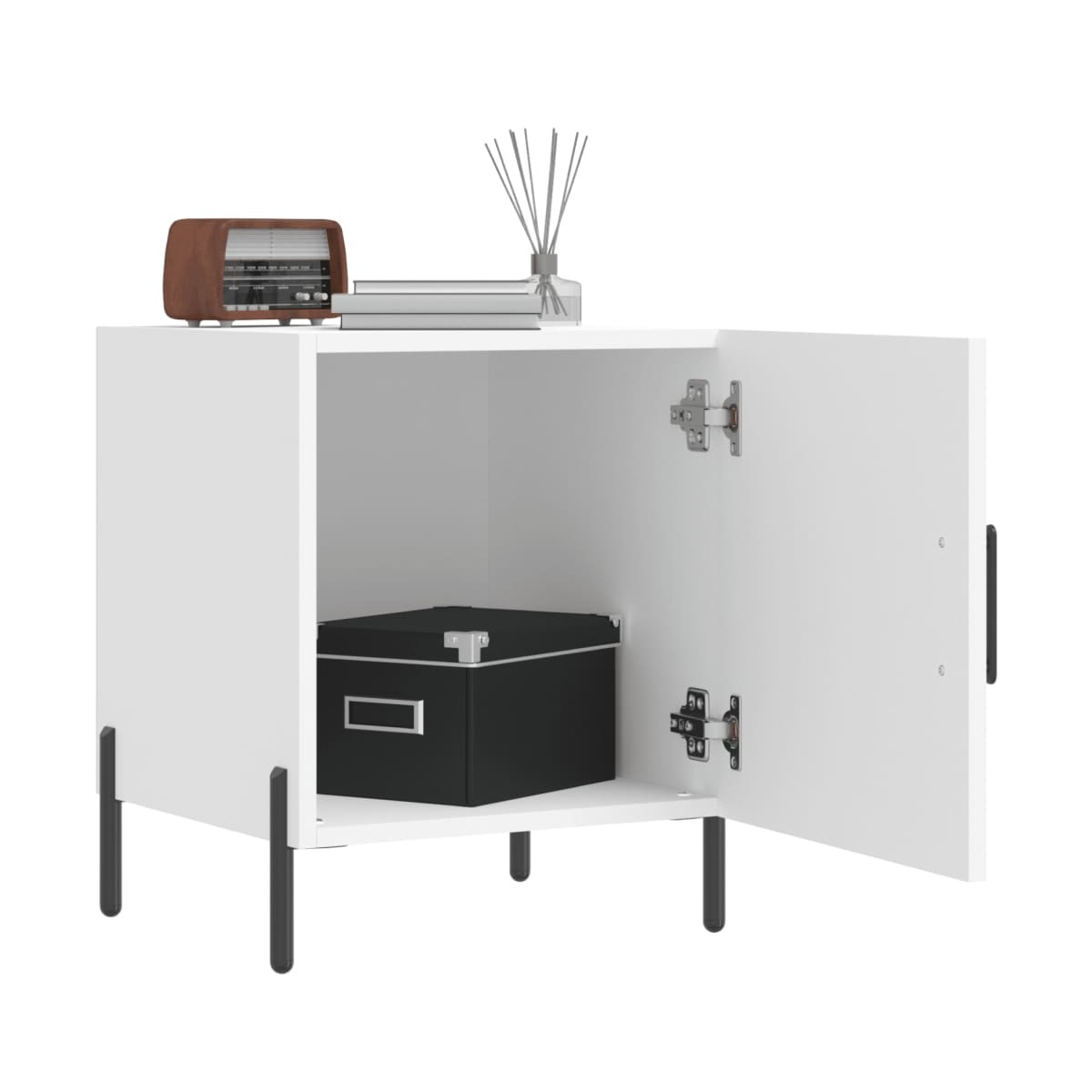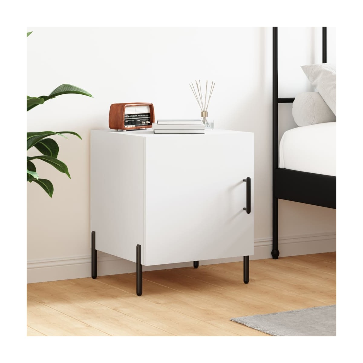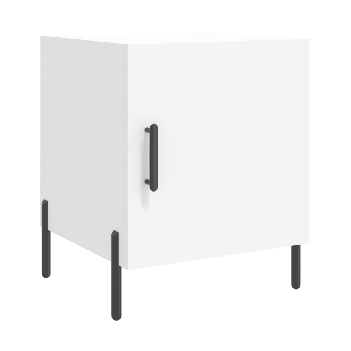 ¡Da un toque de encanto moderno a la casa con esta mesita de noche! Material duradero: La madera de ingeniería tiene una calidad excepcional, con una superficie lisa y también cuenta con fuerza, estabilidad y resistencia a la humedad. Amplio espacio de almacenaje: La mesita de noche tiene un compartimento, por lo que ofrece un amplio espacio de almacenaje para mantener al alcance libros, aparatos multimedia y otros objetos.Función expositora: También puedes colocar tus fotos favoritas, adornos o flores en la superficie de esta mesita auxiliar para alegrarte la vida. Patas de metal: Las patas metálicas añaden un estilo tranquilo a la casa a la vez que garantizan la estabilidad.Práctica puerta: Mantén tus cosas libres de polvo ocultándolas detrás de la puerta. Advertencia: Para evitar que vuelque, este producto debe usarse con el dispositivo de fijación a la pared incluido.