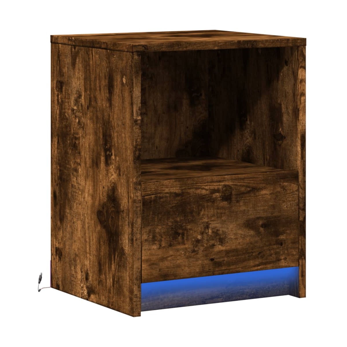 Con un diseño elegante, esta mesita de noche se integrará fácilmente en tu dormitorio o salón, aportando un encanto atemporal a tu decoración. Material duradero:La madera de ingeniería tiene una calidad excepcional, con una superficie lisa y también con fuerza, estabilidad y resistencia a la humedad.Amplio espacio de almacenamiento: La mesita de noche con cajón ofrece un amplio espacio de almacenamiento para mantener tus diversos artículos de uso diario bien organizados y al alcance.Luces LED RGB para un ambiente agradable: Esta mesa auxiliar cuenta con luces LED que se pueden ajustar fácilmente para crear un espectáculo de luces personalizado. Puedes personalizar los modos, los colores y el brillo para mejorar el ambiente de tu hogar.Fácil de mantener: Gracias a su superficie lisa, el armario auxiliar es fácil de limpiar con un paño húmedo y requiere menos mantenimiento. Advertencia:Para evitar que vuelque, este producto debe usarse con el dispositivo de fijación a la pared suministrado.Información útil:El producto tiene un conector USB que necesita una fuente de alimentación USB certificada de 5 V (no incluida).