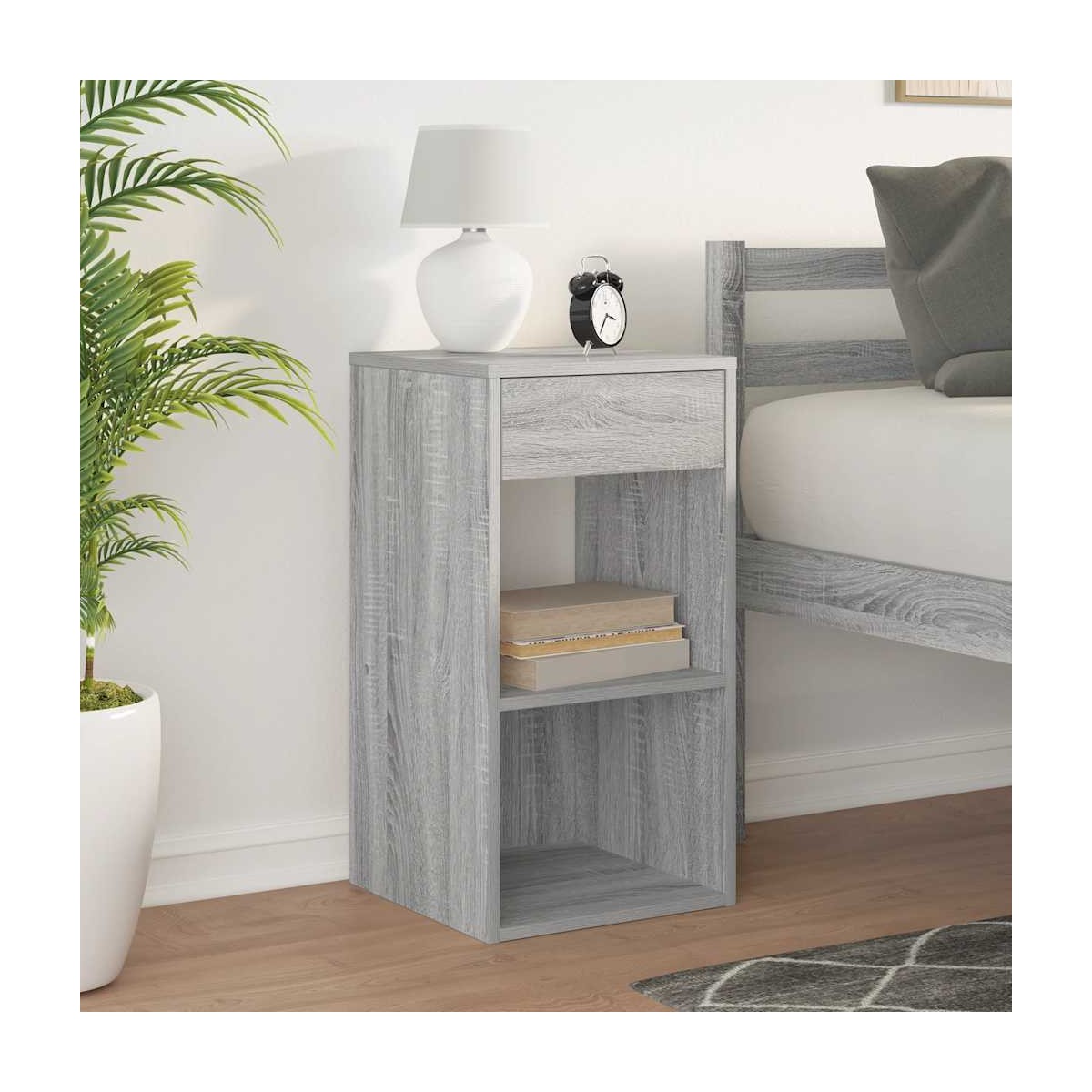 Ya sea que desees buscar tu libro favorito o guardar tus elementos esenciales para la noche, esta mesita de noche combina estilo y practicidad, lo que la convierte en una excelente opción para tu mesilla de noche. Material estable y duradero: La madera de ingeniería es un material duradero y estable con una superficie lisa que es resistente a la humedad, la deformación y la rotura, lo que la convierte en una opción fiable para una variedad de proyectos.Amplio espacio de almacenamiento: el gabinete ofrece un amplio espacio de almacenamiento con un cajón y dos compartimentos de almacenamiento abiertos, lo que le permite organizar y almacenar artículos como libros, revistas o pertenencias personales, manteniendo su dormitorio ordenado.Uso práctico: Con una altura ideal para un fácil acceso desde la cama, esta mesa está diseñada para brindar funcionalidad y comodidad. Los cajones cuentan con manijas prácticas, lo que garantiza que se abran de manera suave y sin esfuerzo.Fácil de mantener: Gracias a su superficie lisa, el armario es fácil de limpiar con un paño húmedo y requiere menos mantenimiento. Advertencia:Para evitar que vuelque, este producto debe usarse con el dispositivo de fijación a la pared suministrado.