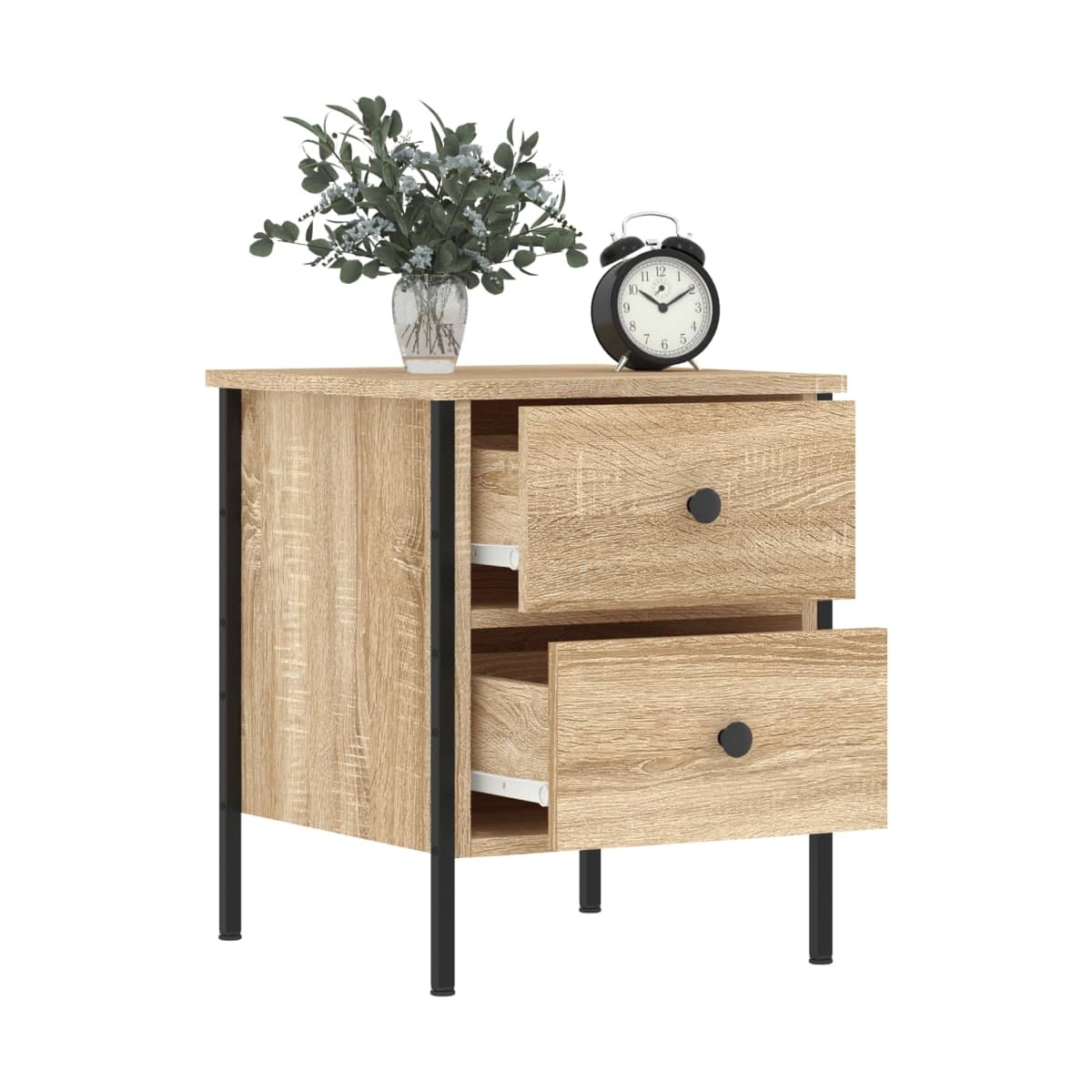 Esta mesita de noche con un diseño industrial es un complemento atemporal para la decoración de la casa. Material duradero: La madera contrachapada tiene una calidad excepcional, con una superficie lisa y también cuenta con fuerza, estabilidad y resistencia a la humedad.Estructura robusta: La estructura de hierro de la mesita de noche garantiza su solidez y estabilidad.Amplio espacio de almacenaje: Diseñada con 2 cajones, la mesita auxiliar ofrece un amplio espacio de almacenaje para mantener tus cosas bien organizadas y al alcance.Patas regulables: El mueble auxiliar está equipado con 4 patas regulables que protegen el suelo de los arañazos y lo mantienen estable en suelo irregular.Función expositora: Puedes colocar tus fotos favoritas, adornos o flores en la superficie de esta mesita de noche para alegrarte la vida. Advertencia:Para evitar que vuelque, este producto debe usarse con el dispositivo de fijación a la pared incluido.