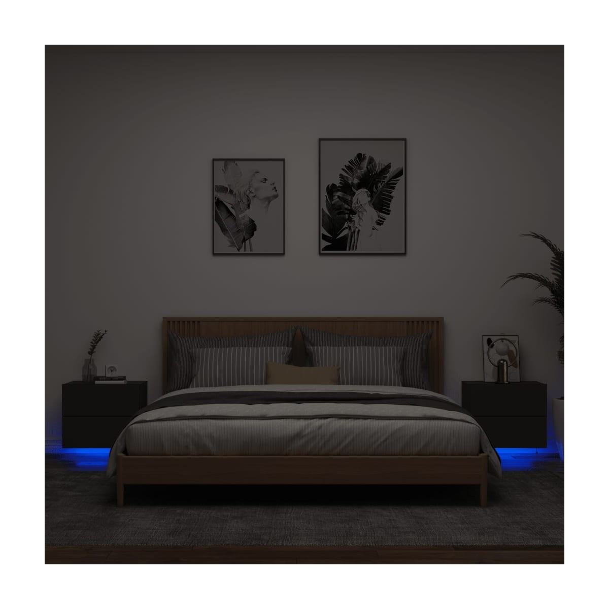 Estas mesitas de noche de pared con luces LED son la solución perfecta para la casa, con el fin de maximizar el espacio y mantener el suelo despejado. Material duradero: La madera de ingeniería es de una calidad excepcional, tiene una superficie lisa y se caracteriza por su fuerza, estabilidad y resistencia a la humedad. Hecha de madera de ingeniería, la mesita de noche de pared es fácil de limpiar.Luces LED RGB: La mesita de noche flotante está equipada con increíbles luces LED RGB. Con diversos menús personalizables, puedes cambiar el color de las luces sin esfuerzo e incluso hacer que se ajusten automáticamente. Estas luces LED no sólo realzan el aspecto moderno del armario, sino que también le dan un toque a la moda.Diseño de pared: Esta mesita de noche flotante puede ser montada en la pared para aportar espacio de almacenamiento. De este modo, podrás aprovechar al máximo el espacio del suelo y mantener la zona limpia.Mueble multiusos: La mesita de noche de pared es el lugar ideal para colocar objetos como libros, artículos coleccionables, adornos, etc. Transforma la pared vacía en un elemento de diseño. Información útil:Los tornillos y los tacos para el interior de la pared no están incluidos. Recomendamos encontrar y utilizar tornillos y tacos adecuados específicamente para las paredes. Si no estás seguro, puedes consultar con un profesional. Lee y sigue cada paso de las instrucciones.El producto tiene un conector USB que necesita una fuente de alimentación USB certificada de 5 V (no incluida).