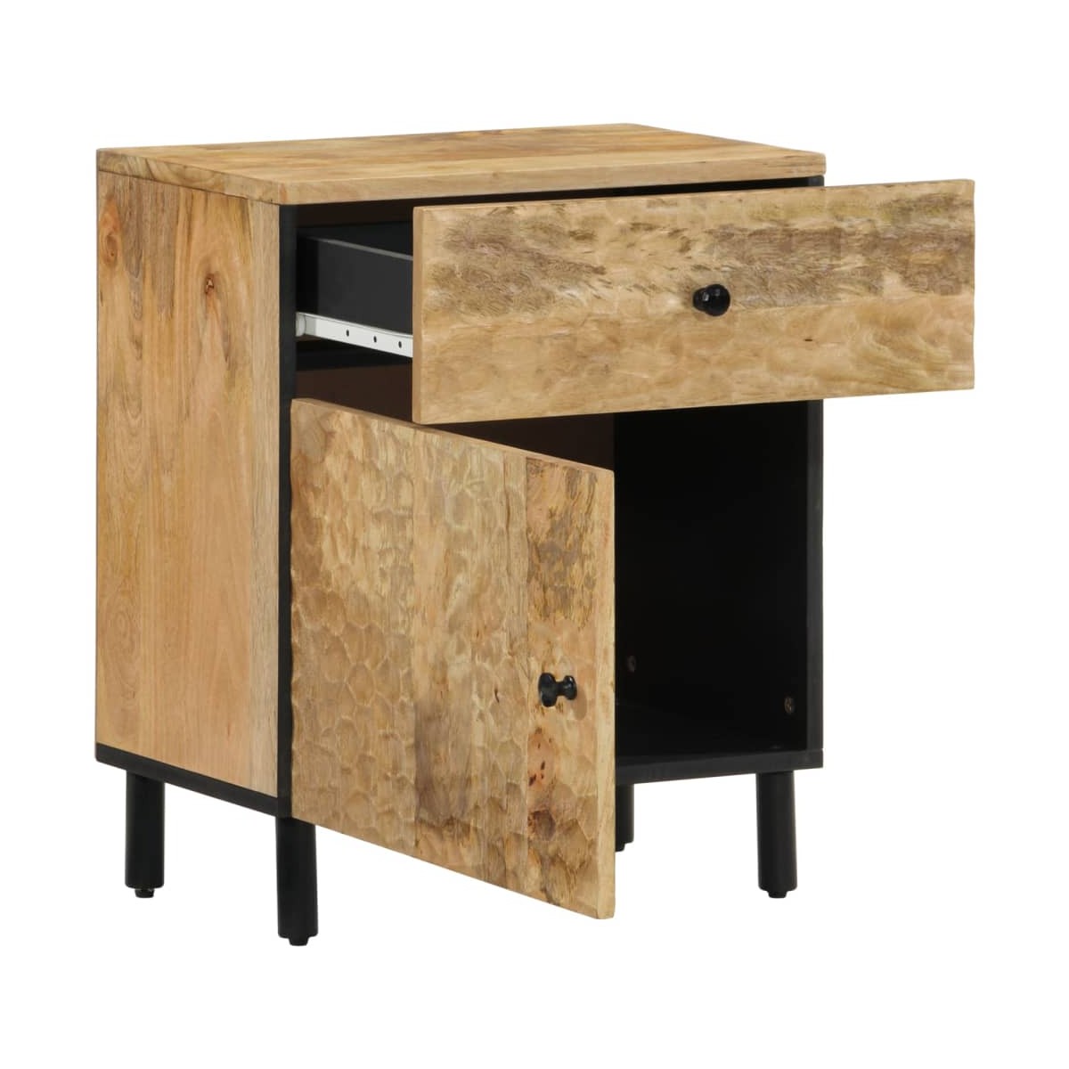 Esta mesita de noche, con un diseño elegante, es un aporte atemporal para la decoración de tu hogar. Madera maciza de mango: La madera maciza de mango es una madera dura, tropical y resistente, que sirve para fabricar muebles robustos. Las bonitas vetas de la madera hacen que cada mueble sea ligeramente diferente al resto. Hecho de madera maciza de mango, el mueble es duradero y estable.Amplio espacio de almacenamiento: La mesita de noche está diseñada con 1 cajón y 1 puerta para mantener las cosas organizadas y al alcance.Superficie estable: La superficie de este mueble auxiliar es perfecta para exponer objetos decorativos, marcos de fotos y plantas.Patas resistentes: Las patas de hierro aumentan la robustez y estabilidad de los muebles del dormitorio. Advertencia:Para evitar que vuelque, este producto debe usarse con el dispositivo de fijación a la pared suministrado.
