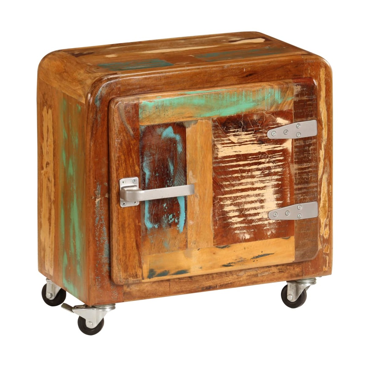 Esta mesita de noche de madera de estilo clásico emana un encanto vintage. Será un llamativo aporte para tu hogar. La mesita de noche está hecha de madera reciclada maciza que ha sido obtenida de vigas, suelos y vigas de apoyo de edificios antiguos que se están demoliendo por lo que consta de diferentes tipos de madera como pino, teca, haya, roble, cedro, mango, acacia, etc. Esto significa que la madera reciclada conserva las características de estos diferentes tipos de madera. La madera reciclada ya está envejecida, desgastada y seca, y por lo tanto no se encogerá ni se doblará. Esta mesita de noche está hecha a mano y las vetas de la madera de bonito aspecto hacen que cada pieza de mobiliario sea distintiva y ligeramente diferente del resto. El herraje de metal agrega al mueble un estilo industrial. Este armario proporciona espacio para almacenar sus libros, cuadernos de notas, bolígrafos y otros artículos. Equipado con 4 ruedas, el armario es fácil de mover. Nota importante: Los colores varían de pieza a pieza, por lo que cada pieza es única; la entrega es aleatoria.