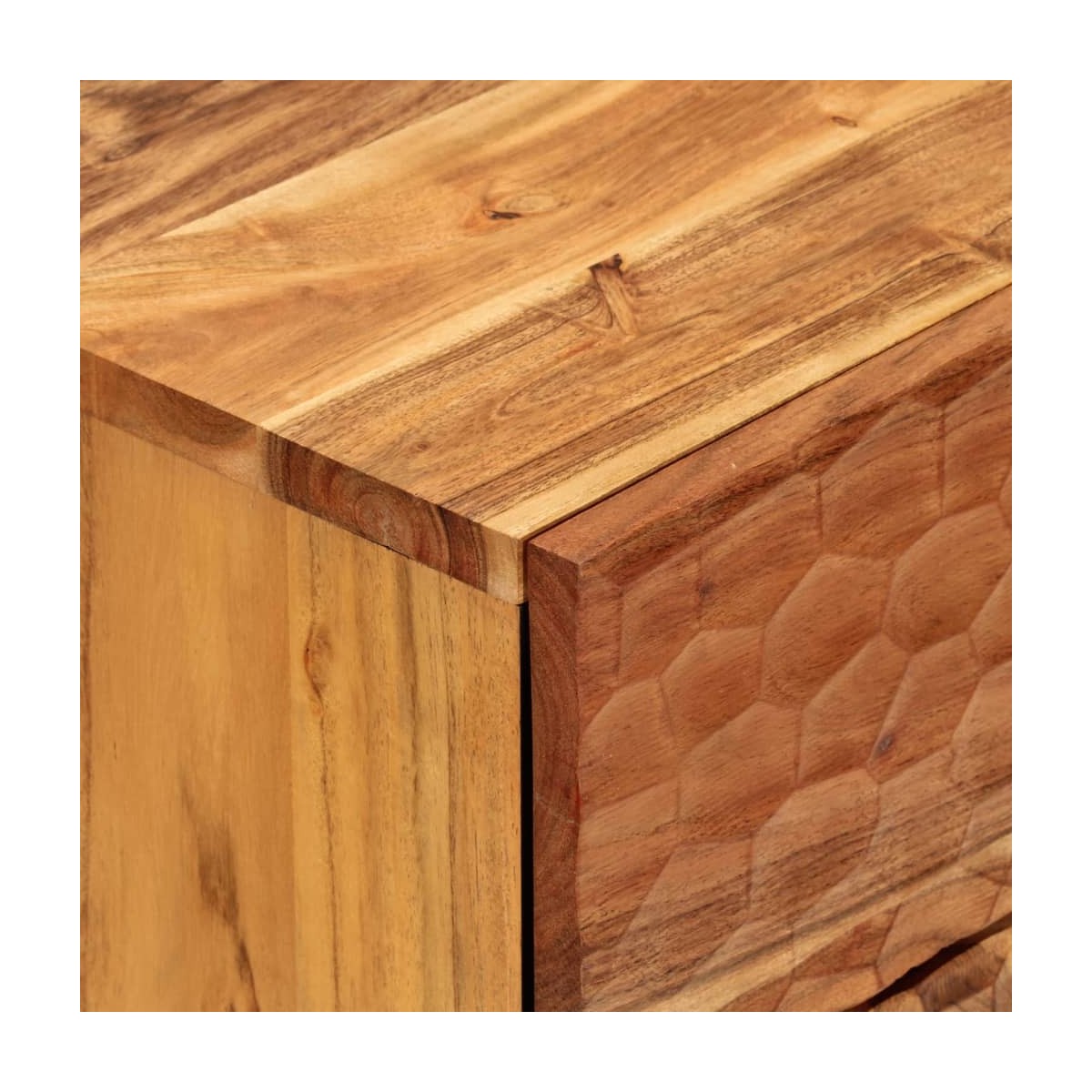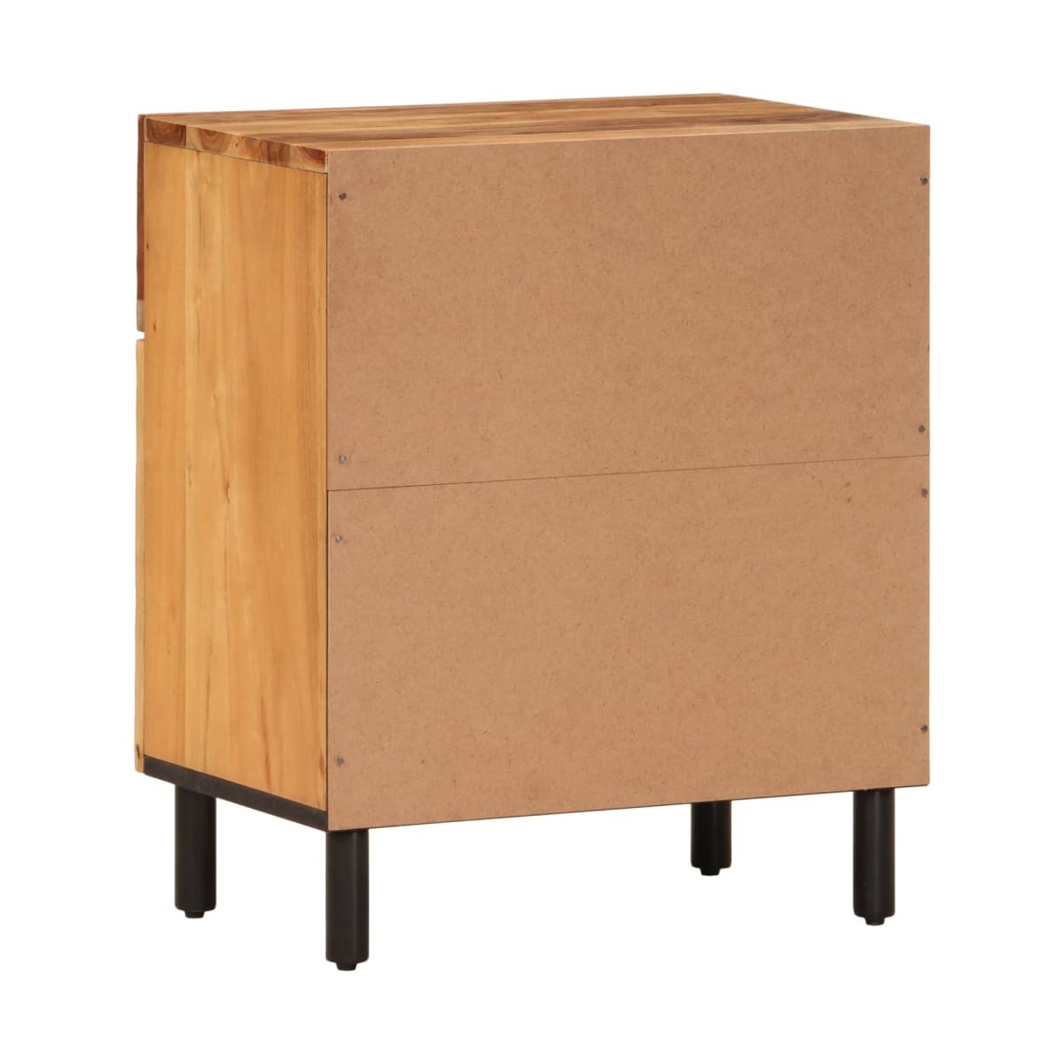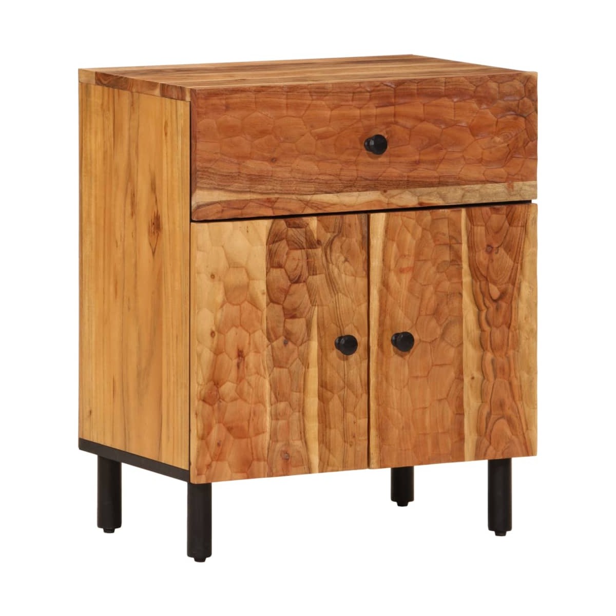Esta mesita de noche, con un diseño elegante, es un aporte atemporal para la decoración de tu hogar. Material de primera calidad: La madera maciza de acacia es un bonito material natural. La madera de acacia es una madera dura tropical, densa, robusta y duradera.Amplio espacio de almacenamiento: La mesita de noche está diseñada con 1 cajón y 2 puertas para mantener las cosas organizadas y al alcance.Superficie estable: La superficie de este mueble auxiliar es perfecta para exponer objetos decorativos, marcos de fotos y plantas.Patas resistentes: Las patas de hierro aumentan la robustez y estabilidad de los muebles del dormitorio. Advertencia:Para evitar que vuelque, este producto debe usarse con el dispositivo de fijación a la pared suministrado.