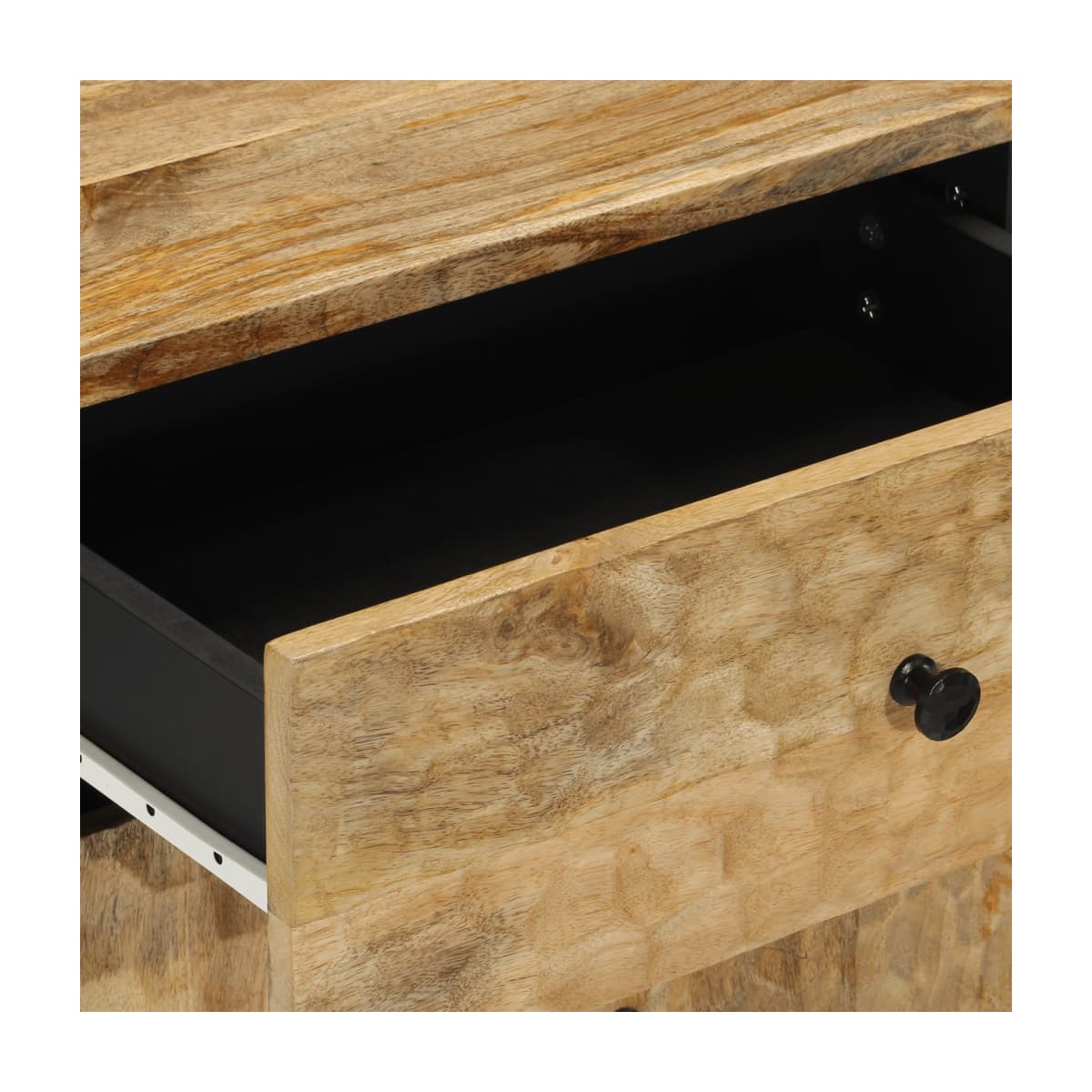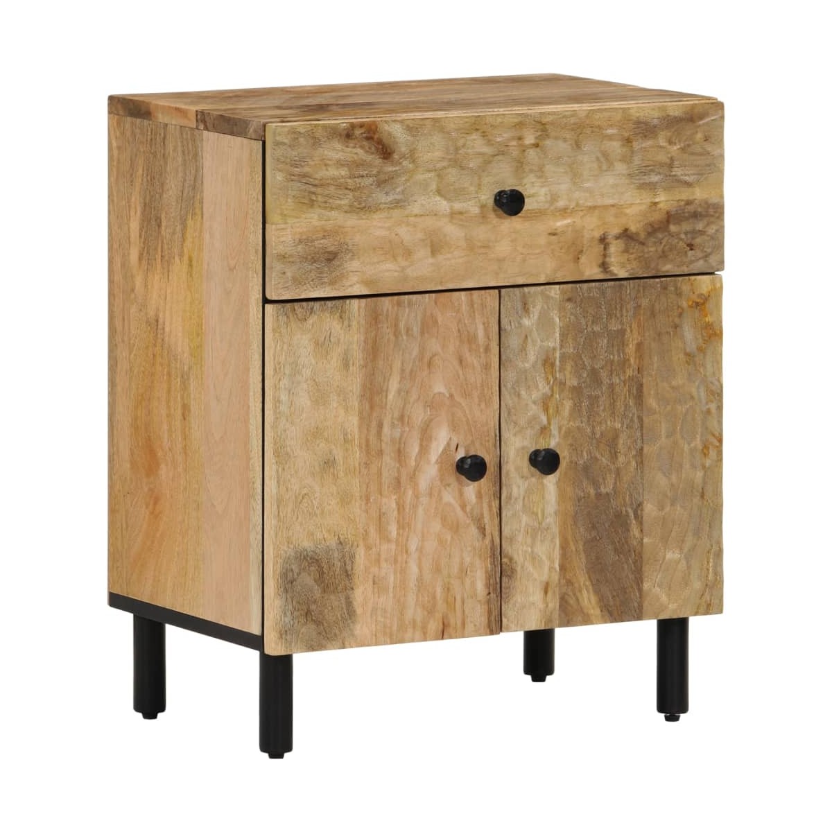 Esta mesita de noche, con un diseño elegante, es un aporte atemporal para la decoración de tu hogar. Madera maciza de mango: La madera maciza de mango es una madera dura, tropical y resistente, que sirve para fabricar muebles robustos. Las bonitas vetas de la madera hacen que cada mueble sea ligeramente diferente al resto. Hecho de madera maciza de mango, el mueble es duradero y estable.Amplio espacio de almacenamiento: La mesita de noche está diseñada con 1 cajón y 2 puertas para mantener las cosas organizadas y al alcance.Superficie estable: La superficie de este mueble auxiliar es perfecta para exponer objetos decorativos, marcos de fotos y plantas.Patas resistentes: Las patas de hierro aumentan la robustez y estabilidad de los muebles del dormitorio. Advertencia:Para evitar que vuelque, este producto debe usarse con el dispositivo de fijación a la pared suministrado.