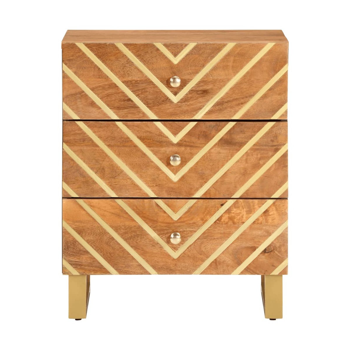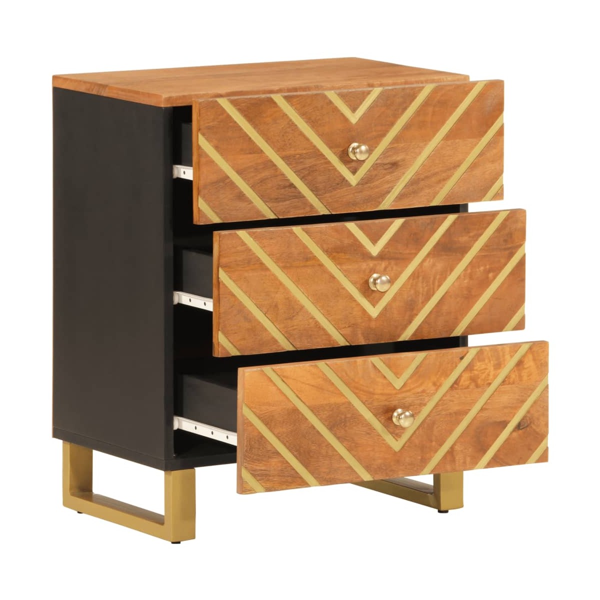 Esta mesita de noche, con un diseño elegante, es un aporte atemporal para la decoración de tu hogar. Madera maciza de mango: La madera maciza de mango es una madera dura, tropical y resistente, que sirve para fabricar muebles robustos. Las bonitas vetas de la madera hacen que cada mueble sea ligeramente diferente al resto. Hecho de madera maciza de mango, el mueble es duradero y estable.Amplio espacio de almacenaje: La mesita de noche está diseñada con 3 cajones para guardar las cosas organizadas y al alcance.Superficie estable: La superficie de este mueble auxiliar es perfecta para exponer objetos decorativos, marcos de fotos y plantas.Patas resistentes: Las patas de hierro aumentan la robustez y estabilidad de los muebles del dormitorio. Advertencia:Para evitar que vuelque, este producto debe usarse con el dispositivo de fijación a la pared incluido.