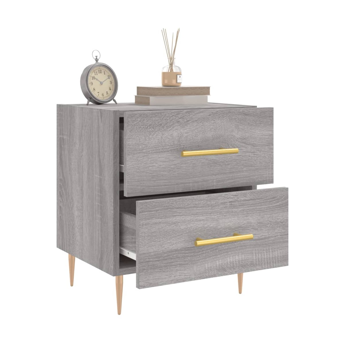 ¡Da un toque de encanto moderno a la casa con estas mesitas de noche! Material duradero: La madera contrachapada tiene una calidad excepcional, con una superficie lisa y también cuenta con fuerza, estabilidad y resistencia a la humedad. Almacenaje amplio: La mesita de noche tiene cajones, que ofrecen un amplio espacio de almacenaje para mantener al alcance libros, aparatos multimedia y otros objetos.Función expositora: También puedes colocar tus fotos favoritas, adornos o flores en la superficie de esta mesita auxiliar para alegrarte la vida. Patas de metal: Las patas metálicas añaden un estilo tranquilo a la casa a la vez que garantizan la estabilidad.