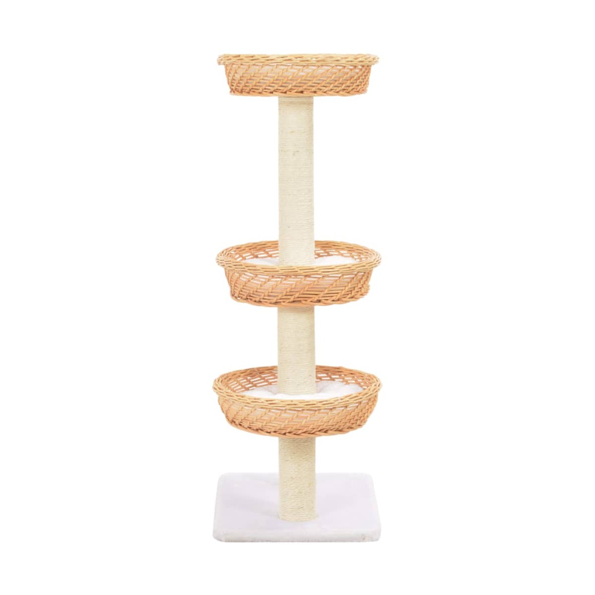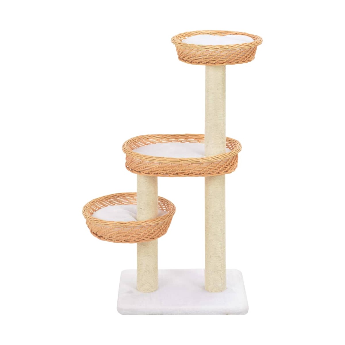 Con este rascador hecho a mano, sus gatos podrán afilarse las uñas, posarse, escalar o relajarse, según prefieran. Gracias a su bonito y compacto diseño, el rascador se adaptará perfectamente a cualquier decoración. Este rascador para gatos también le dará a su pequeño amigo la posibilidad de estirarse y hacer ejercicio, especialmente en los fríos meses de invierno, cuando esté encerrado en casa. Los postes están recubiertos de cuerda de sisal, que es extremadamente cómoda y práctica para que sus amigos felinos afilen sus garras. El rascador incluye además 3 acogedoras cestas de sauce para que su gato pueda echarse una siesta o descansar. También tiene cojines extraíbles donde su mascota puede tumbarse cómodamente. Este rascador para gatos de madera natural es fácil de montar y mantener.