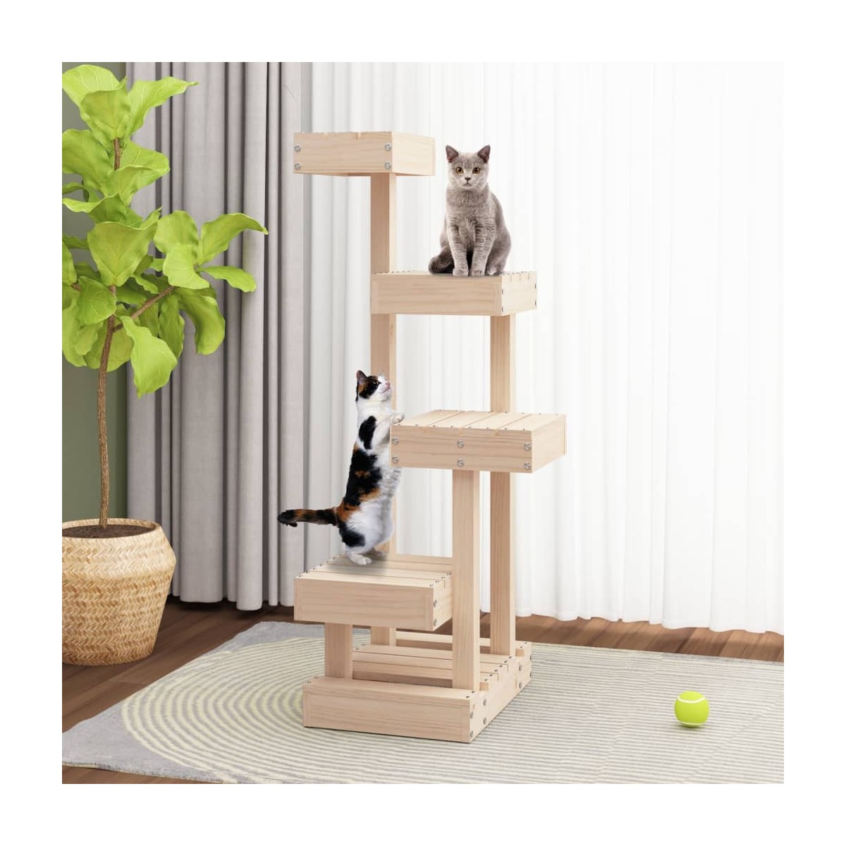 ¡Mantén entretenidos a tus adorables gatos sin parar con este práctico árbol para gatos! Práctico árbol para gatos: El mueble para gatos con varios niveles está diseñado con 4 plataformas, por lo que proporciona un lugar perfecto para que los gatos trepen, se encaramen y también se relajen.Material duradero: La madera maciza de pino es un hermoso material natural. La madera de pino tiene vetas rectas, y los nudos dan al material su distintivo aspecto rústico.Estructura robusta: La estructura de madera del árbol para gatos garantiza la solidez y la estabilidad. Nota:Cada producto viene con un manual de montaje en la caja para facilitar el montaje.