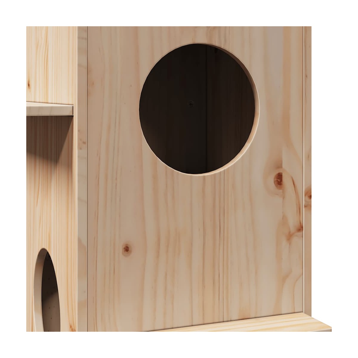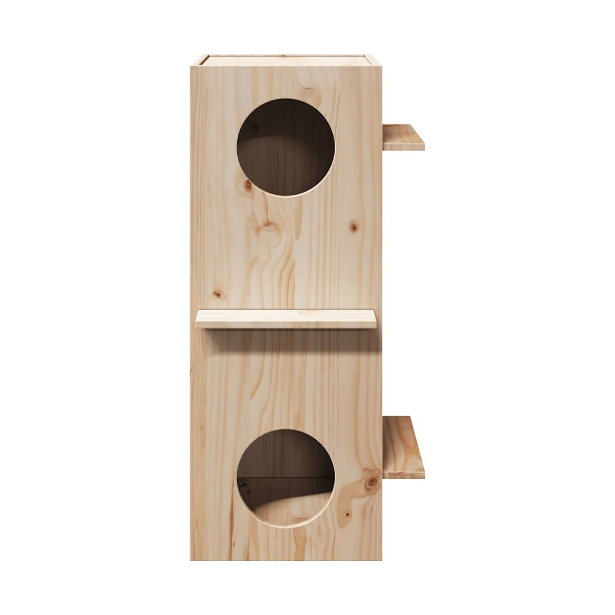 Esta casa de madera para gatos está diseñada para proporcionar a tu gato un espacio privado para dormir y jugar. Estructura estable y duradera: La madera de pino maciza es conocida por su resistencia y durabilidad. Sus vetas rectas y sus característicos nudos contribuyen a su encanto rústico.Interior espacioso: este mueble para gatos ofrece un amplio espacio para que su gato se estire y se relaje, lo que lo convierte en un escondite ideal para descansar o tomar una siesta.Parte superior resistente: la parte superior resistente de la casa para gatos proporciona una superficie estable para un descanso adicional o como una percha para que su gato observe su entorno.Peldaños incorporados: la casa para gatos viene con peldaños incorporados para subir fácilmente a la parte superior resistente, lo que garantiza que su gato pueda explorar y relajarse fácilmente.Diseño minimalista: el diseño elegante combina a la perfección con cualquier decoración del hogar y al mismo tiempo le brinda a su gato un espacio dedicado para trepar y descansar.