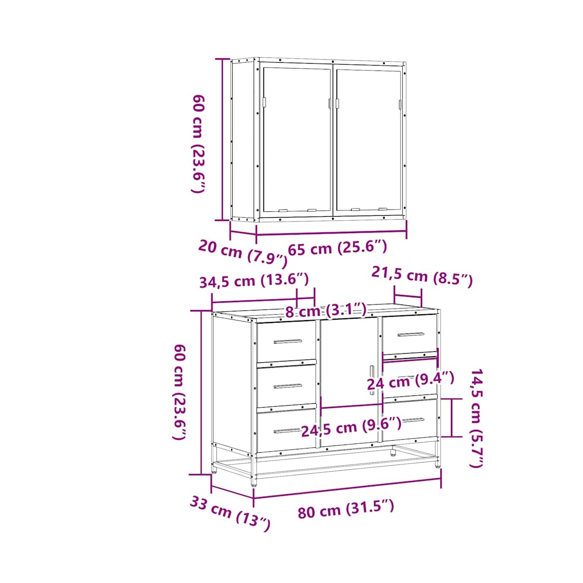 - Dimensiones del armario del lavabo: 80 x 33 x 60 cm (ancho x profundo x alto)