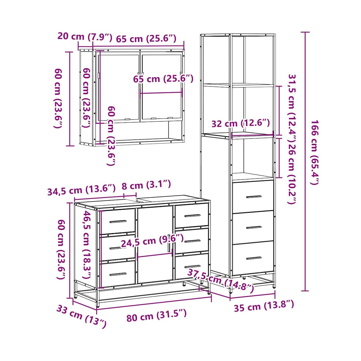 - Dimensiones del mueble de baño: 35 x 37,5 x 166 cm (largo x ancho x alto)