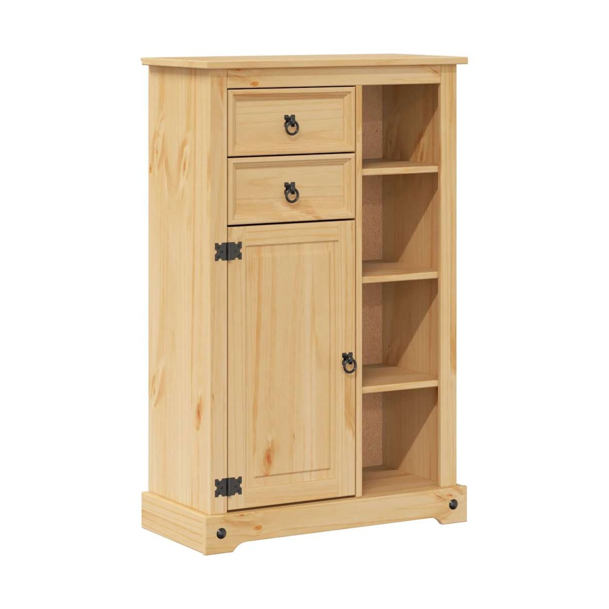 - Material: Madera maciza de pino con acabado encerado de miel, madera de ingeniería, metal