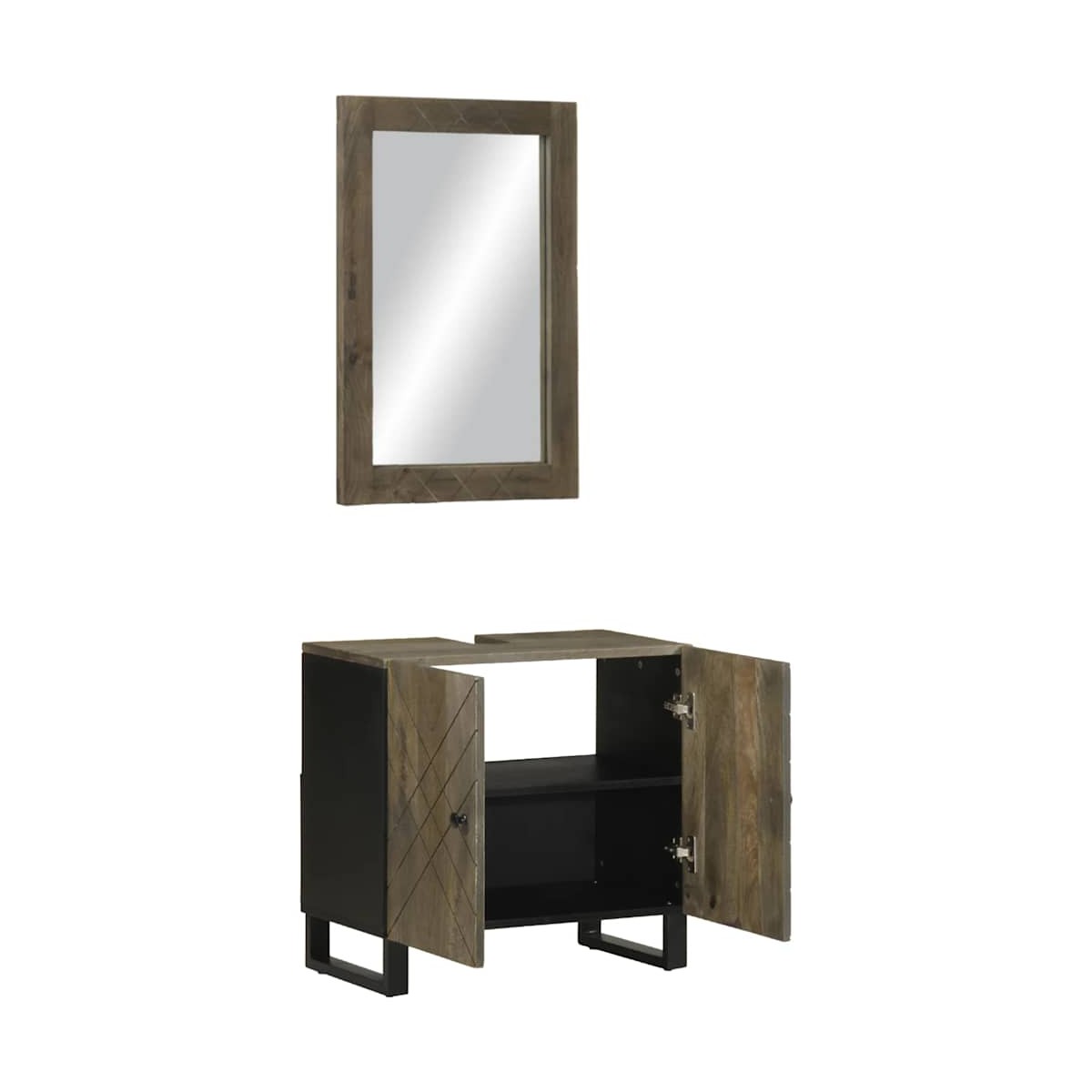 ¡Este elegante conjunto de muebles de baño es un excelente aporte para el baño y le da un aspecto ordenado y llamativo! Material robusto y estable: La madera maciza de mango, una madera dura tropical robusta, es muy apreciada para la fabricación de muebles por su excepcional durabilidad y resistencia. Las bonitas vetas de la madera hacen que cada mueble sea ligeramente diferente al resto.Material duradero: este espejo de tocador está hecho de vidrio rodeado por un marco de madera de mango macizo, lo que garantiza estabilidad y durabilidad.Patas de metal: este gabinete está sostenido por patas de metal resistentes para garantizar estabilidad, seguridad y firmeza.Amplio espacio de almacenamiento: Este mueble de baño ofrece un amplio espacio de almacenamiento para mantener tus elementos esenciales bien organizados y al alcance.Práctica puerta: La puerta del armario proporciona un espacio de almacenamiento cerrado para mantener tus pertenencias organizadas, protegidas y fuera de la vista. Advertencia:Para evitar que vuelque, este producto debe usarse con el dispositivo de fijación a la pared suministrado. Información útil:Cada artículo es único, con variaciones de color y veta. La entrega es aleatoria garantizando la exclusividad y la individualidad del producto.Los tornillos y los tacos para el interior de la pared no están incluidos. Recomendamos encontrar y utilizar tornillos y tacos adecuados específicamente para las paredes. Si no estás seguro, puedes consultar con un profesional. Lee y sigue cada paso de las instrucciones.