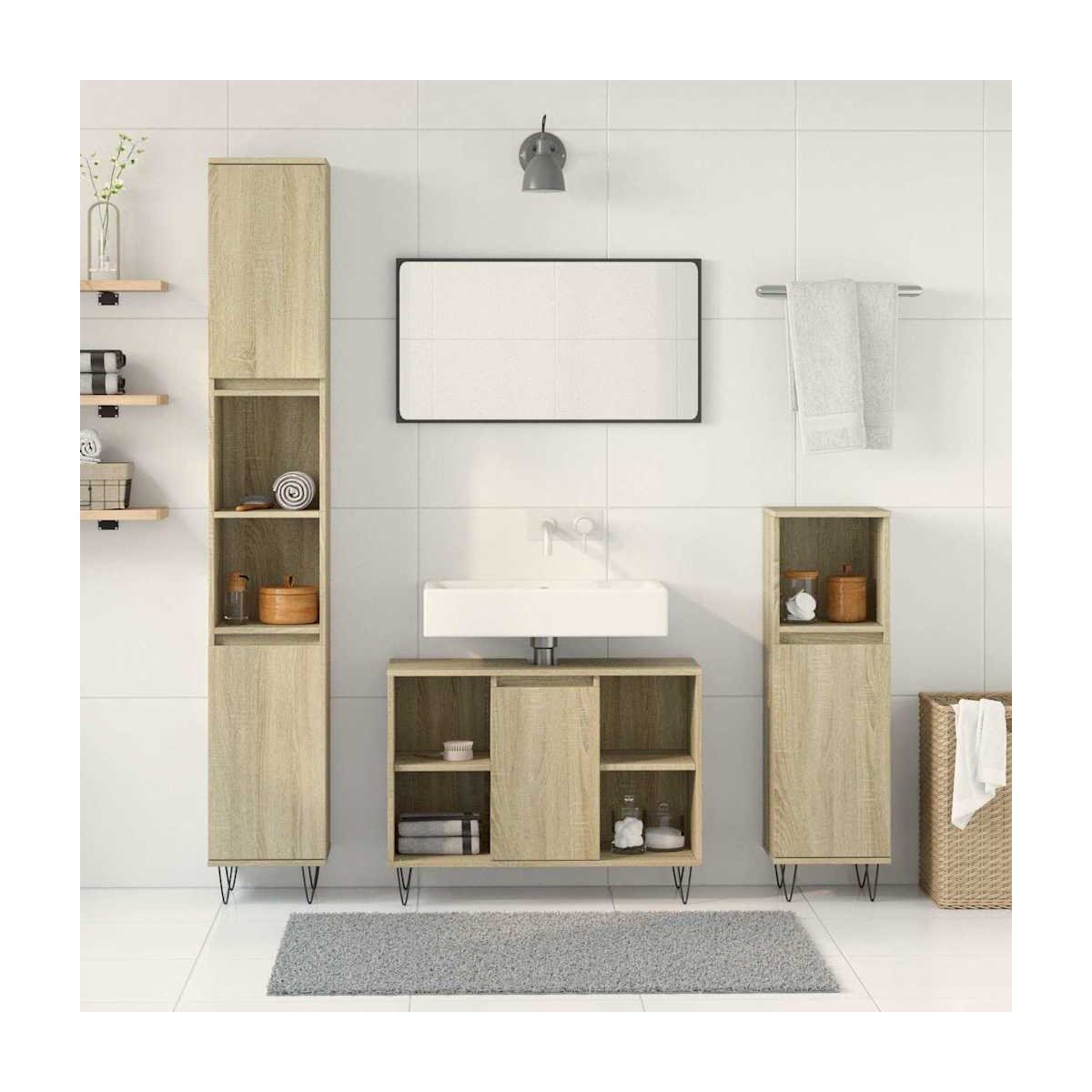 ¡Este elegante conjunto de muebles de baño es un excelente aporte para el baño y le da un aspecto ordenado y llamativo! Material duradero: La madera contrachapada tiene una calidad excepcional, con una superficie lisa y también cuenta con fuerza, estabilidad y resistencia a la humedad.Amplio espacio de almacenamiento: Este mueble de baño ofrece un amplio espacio de almacenamiento para acomodar fácilmente tus artículos de tocador y baño esenciales, como jabones, champú, pasta de dientes, etc.Patas de hierro: Las patas de hierro dan un estilo industrial a la casa, además de garantizar la estabilidad del mueble de almacenaje para el baño.Puerta práctica: Mantén ordenado el espacio al esconder los pequeños objetos básicos detrás de la puerta de este aparador. Y la puerta se puede montar a la izquierda o a la derecha según tus preferencias. Información útil:Los tornillos y los tacos para el interior de la pared no están incluidos. Te recomendamos buscar y utilizar tornillos y tacos adecuados específicamente para tus paredes. Si no estás seguro, puedes consultar con un profesional. Lee y sigue cada paso de las instrucciones. Advertencia:Para evitar que vuelque, este producto debe usarse con el dispositivo de fijación a la pared suministrado.