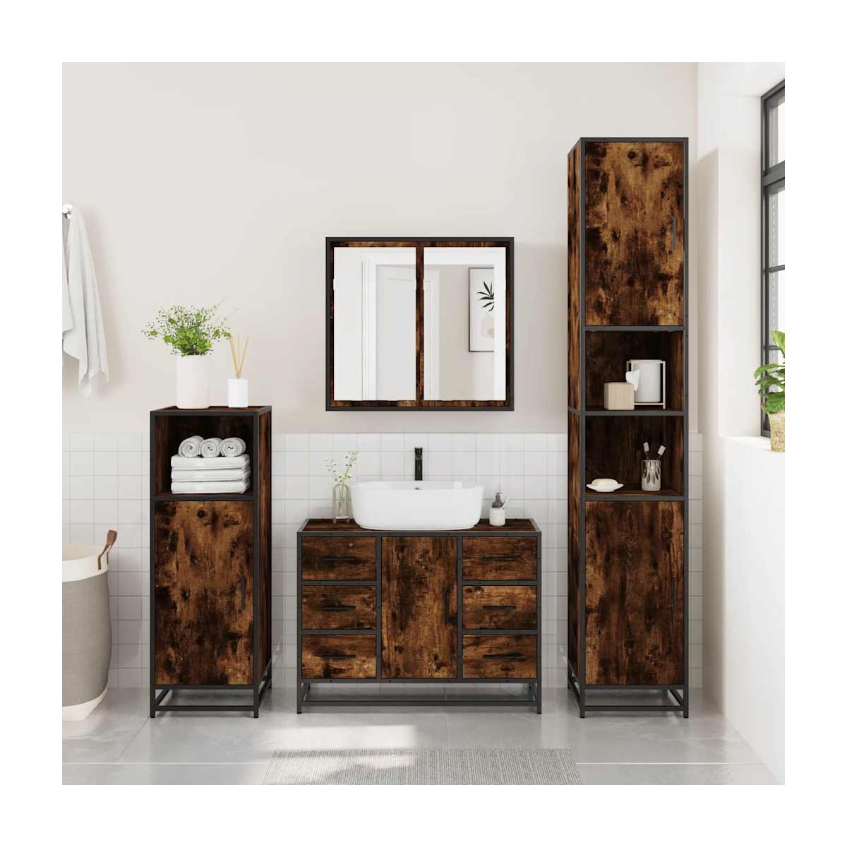 ¡Este elegante conjunto de muebles de baño es un excelente aporte para el baño y le da un aspecto ordenado y llamativo! Material estable y duradero: La madera de ingeniería es un material duradero y estable con una superficie lisa que es resistente a la humedad, la deformación y la rotura, lo que la convierte en una opción fiable para una variedad de proyectos.Estructura estable y duradera: La estructura metálica del armario realza tu hogar con un estilo industrial y proporciona una durabilidad, estabilidad y resistencia a la corrosión excepcionales.Amplio espacio de almacenamiento: Este mueble de baño ofrece un amplio espacio de almacenamiento para mantener tus elementos esenciales bien organizados y al alcance.Práctico mueble superior: La parte superior del mueble del fregadero tiene un agujero, por lo que es ideal para colocar el lavabo.Función de montaje en pared: El armario con espejo se cuelga en la pared, optimizando el espacio al no ocupar suelo, ideal para baños más pequeños. Advertencia:Para evitar que vuelque, este producto debe usarse con el dispositivo de fijación a la pared suministrado. Información útil:Los tornillos y los tacos para el interior de la pared no están incluidos. Recomendamos encontrar y utilizar tornillos y tacos adecuados específicamente para las paredes. Si no estás seguro, puedes consultar con un profesional. Lee y sigue cada paso de las instrucciones.