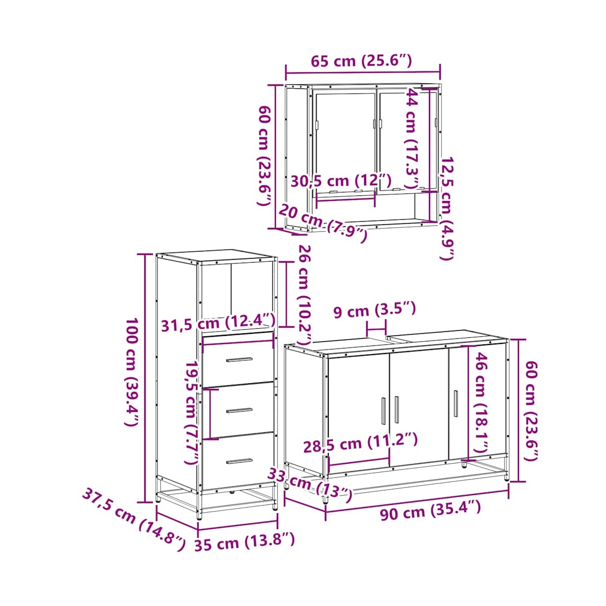 - Dimensiones del mueble de baño: 35 x 37,5 x 100 cm (ancho x profundo x alto)