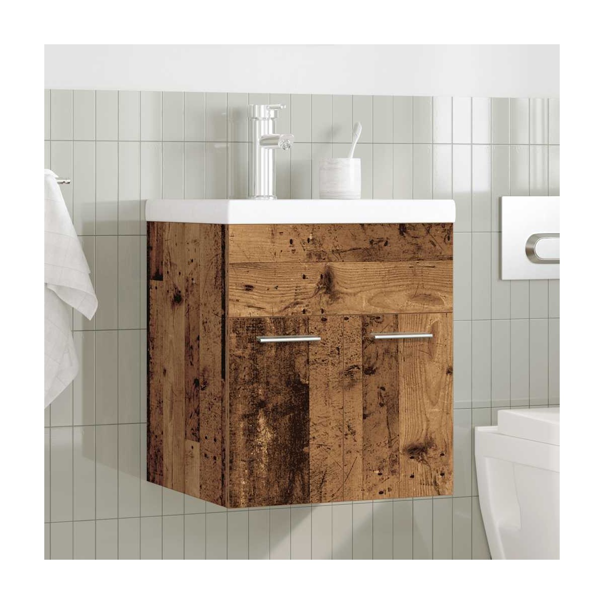 Este elegante mueble lavabo con lavabo y grifo incorporados, con amplio espacio de almacenamiento, es una excelente incorporación a su baño, dándole un aspecto ordenado y llamativo. Material resistente: El gabinete debajo del fregadero está hecho de material de calidad excepcional con una superficie lisa y también presenta resistencia, estabilidad y resistencia a la humedad.Amplio almacenaje: El armario de baño posee un cajón, que ofrece un amplio espacio de almacenamiento para guardar artículos en el baño.Diseño práctico: La parte superior de este armario de baño es ideal para colocar el lavamanos.Función de montaje en la pared: El armario del baño puede montarse en la pared para añadir espacio de almacenamiento adicional. Así podrás aprovechar al máximo el espacio del suelo y mantener la zona limpia.Rebosadero: También está equipado con un agujero de desagüe para que fluya el agua cuando se llena demasiado. Información útil:Los tornillos y los tacos para el interior de la pared no están incluidos. Busca y utiliza tornillos y tacos adecuados para tus paredes. Si no lo tienes claro, busca asesoramiento profesional. Lee y sigue cada paso de las instrucciones cuidadosamente.El grifo y el escurridor de empuje con función de rebosadero están incluidos.El grifo es de agua fría y caliente, y si necesitas agua caliente, hay que conectar un calentador de agua.
