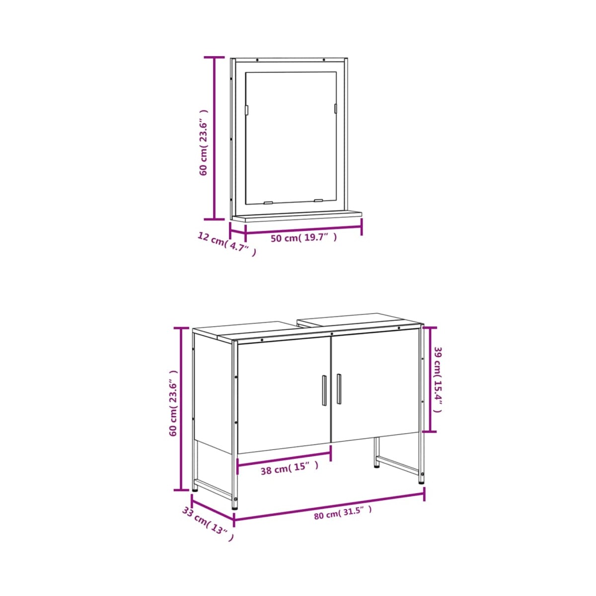 - Dimensiones del armario del lavabo: 80 x 33 x 60 cm (largo x ancho x alto)
