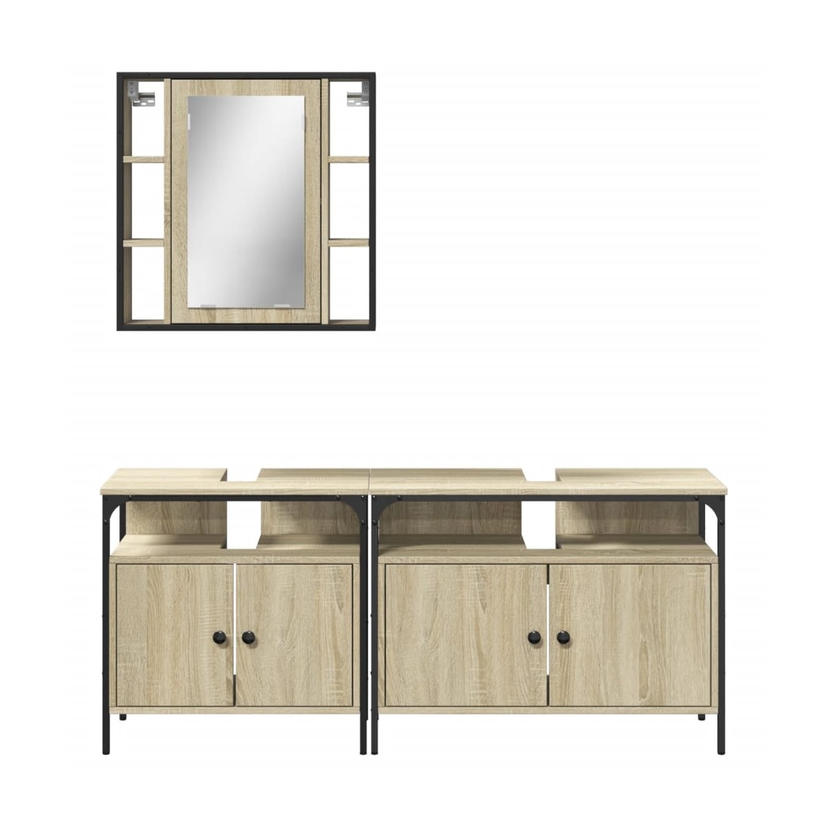 Este atractivo juego de armarios de baño, con amplio espacio de almacenaje, cuenta con un diseño elegante a la par que práctico. Construcción robusta: El acero con recubrimiento en polvo y la madera de ingeniería garantizan una construcción resistente y ofrecen un soporte fuerte a tus cosas.Amplio espacio de almacenaje: Este mueble de baño ofrece un amplio espacio de almacenaje para colocar fácilmente tus artículos esenciales de aseo y baño como jabones, champú, pasta de dientes, etc.Estante de almacenaje extra: El espejo de baño cuenta con un estante inferior que ofrece un plus de espacio de almacenamje para colocar artículos de baño como cepillos de dientes, limpiadores faciales, maquinillas de afeitar, etc.Imagen nítida: La cara de cristal del espejo proporciona un reflejo fino y sin distorsiones, por lo que sirve para maquillarse, afeitarse o mirar si vas bien vestido antes de salir.Patas ajustables: Las patas ajustables con almohadillas de plástico mantienen el armario de baño equilibrado sobre suelos irregulares y aumentan la estabilidad. Advertencia:Para evitar que vuelque, este producto debe usarse con el dispositivo de fijación a la pared suministrado. Información útil:Los tornillos y los tacos para el interior de la pared no están incluidos. Recomendamos encontrar y utilizar tornillos y tacos adecuados específicamente para las paredes. Si no estás seguro, puedes consultar con un profesional. Lee y sigue cada paso de las instrucciones.