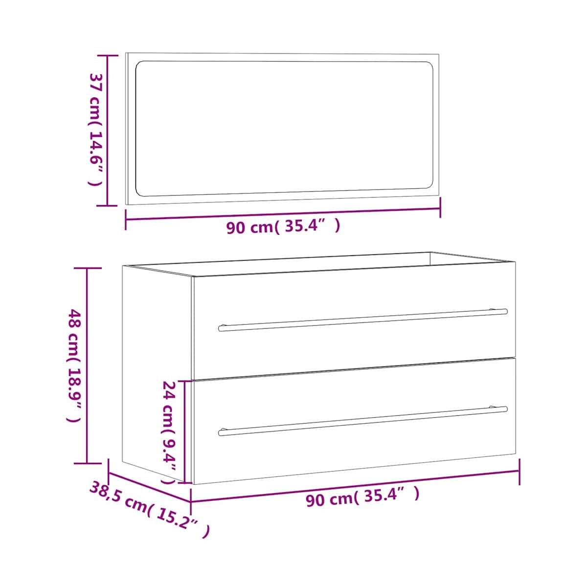 - Dimensiones del armario de baño: 90 x 38,5 x 48 cm (largo x ancho x alto)